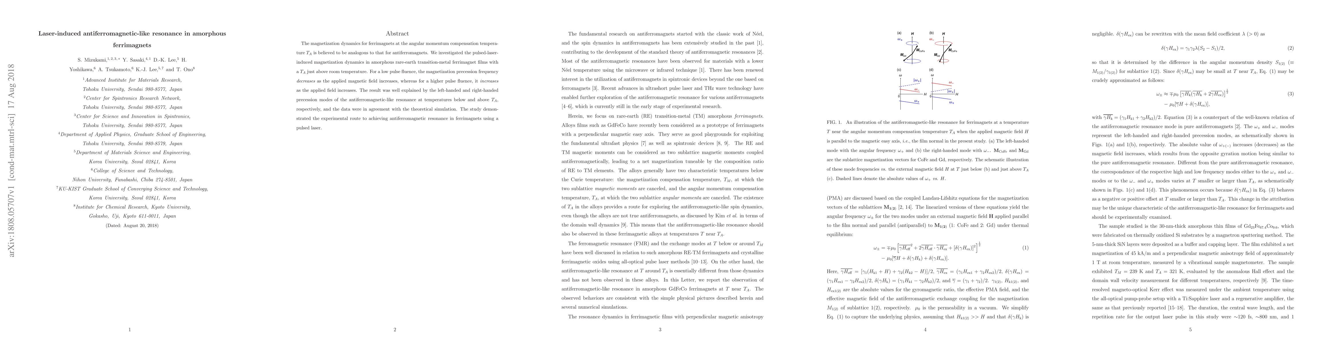 The research investigates amorphous ferrimagnetic films near their angular momentum compensation temperature T_A, revealing unique laser-induced magnetization dynamics analogous to antiferromagnets. Experiments show distinct precession mode behaviors depending on pulse fluence, supported by theoretical simulations, demonstrating a method to induce antiferromagnetic resonance in ferrimagnets via pulsed laser.
