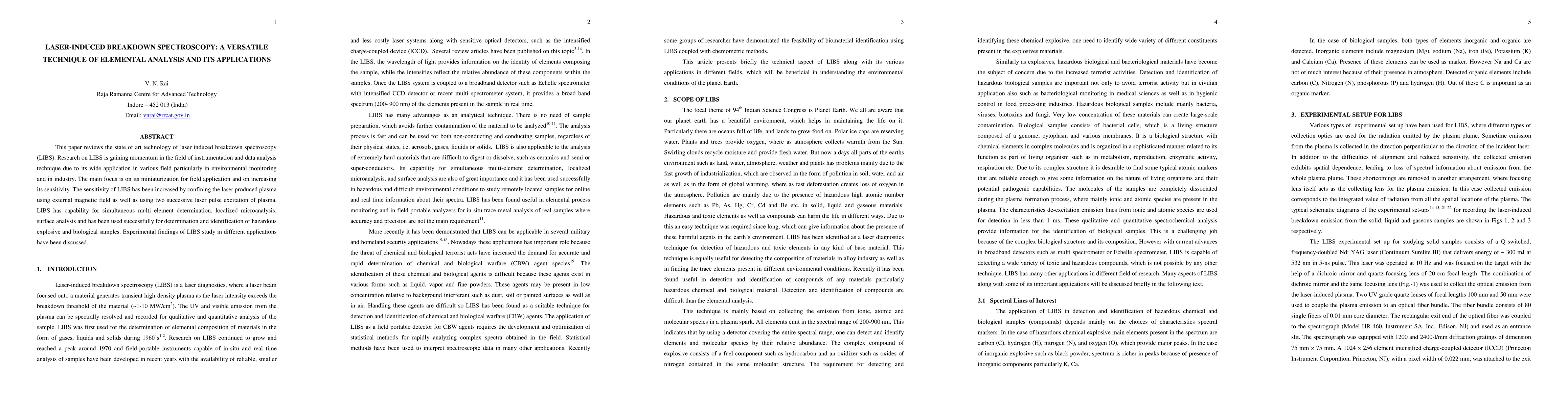 This paper reviews the state of art technology of laser induced breakdown spectroscopy (LIBS). Research on LIBS is gaining momentum in the field of instrumentation and data analysis technique due to its wide application in various field particularly in environmental monitoring and in industry. The main focus is on its miniaturization for field application and on increasing its sensitivity. The sensitivity of LIBS has been increased by confining the laser produced plasma using external magnetic field as well as using two successive laser pulse excitation of plasma. LIBS has capability for simultaneous multi element determination, localized microanalysis, surface analysis and has been used successfully for determination and identification of hazardous explosive and biological samples. Experimental findings of LIBS study in different applications have been discussed.