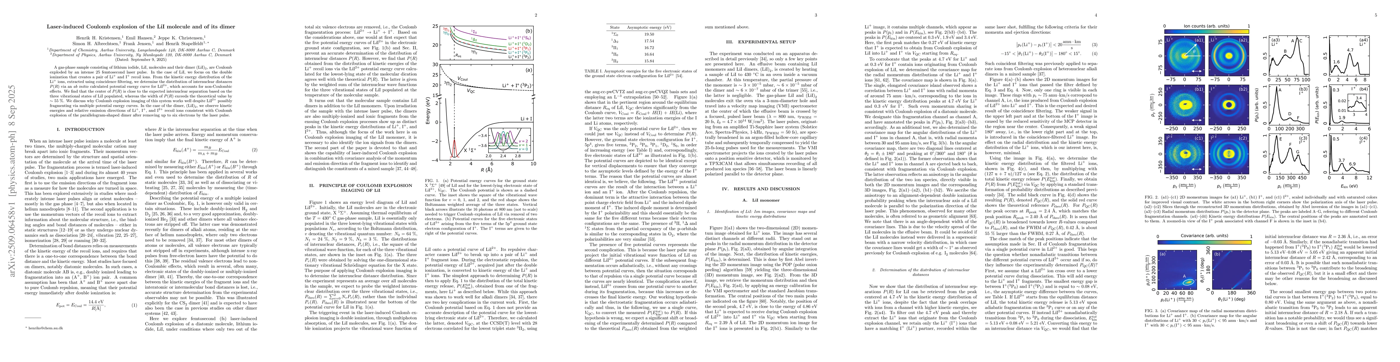 A gas-phase sample consisting of lithium iodide, $\mathrm{LiI}$, molecules and their dimer $\mathrm{(LiI)}_2$, are Coulomb exploded by an intense 25 femtosecond laser pulse. In the case of $\mathrm{LiI}$, we focus on the double ionization that creates a pair of $\mathrm{Li}^+$ and $\mathrm{I}^+$ recoil ions. From the kinetic energy distribution of the $\mathrm{Li}^+$ ions, extracted using coincidence filtering, we determine the distribution of internuclear distances $P(R)$ via an ab initio calculated potential energy curve for $\mathrm{LiI}^{2+}$, which accounts for non-Coulombic effects. We find that the center of $P(R)$ is close to the expected internuclear separation based on the three vibrational states of $\mathrm{LiI}$ populated, whereas the width of $P(R)$ exceeds the theoretical value by $\sim$ 55 %. We discuss why Coulomb explosion imaging of this system works well despite $\mathrm{LiI}^{2+}$ possibly fragmenting via multiple potential energy curves. In the case of the dimer, $\mathrm{(LiI)}_2$, we observe kinetic energies and relative emission directions of $\mathrm{Li}^+$, $\mathrm{I}^+$, and $\mathrm{I}^{2+}$ recoil ions consistent with Coulomb explosion of the parallelogram-shaped dimer after removing up to six electrons by the laser pulse.