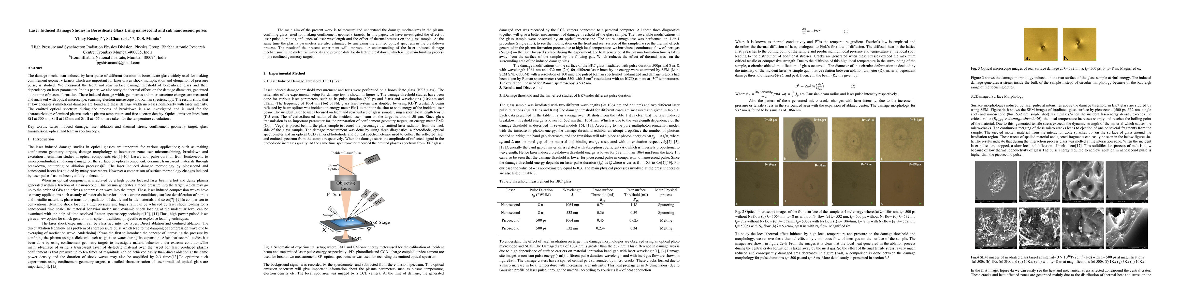 The damage mechanism induced by laser pulse of different duration in borosilicate glass widely used for making confinement geometry targets which are important for laser driven shock multiplication and elongation of pressure pulse, is studied. We measured the front and rear surface damage threshold of borosilicate glass and their dependency on laser parameters. In this paper, we also study the thermal effects on the damage diameters, generated at the time of plasma formation. These induced damage width, geometries and microstructure changes are measured and analyzed with optical microscope, scanning electron microscope and Raman spectroscopy. The results show that at low energies symmetrical damages are found and these damage width increases nonlinearly with laser intensity. The emitted optical spectrum during the process of breakdown is also investigated and is used for the characterization of emitted plasma such as plasma temperature and free electron density. Optical emission lines from Si I at 500 nm, Si II at 385nm and Si III at 455 nm are taken for the temperature calculations.