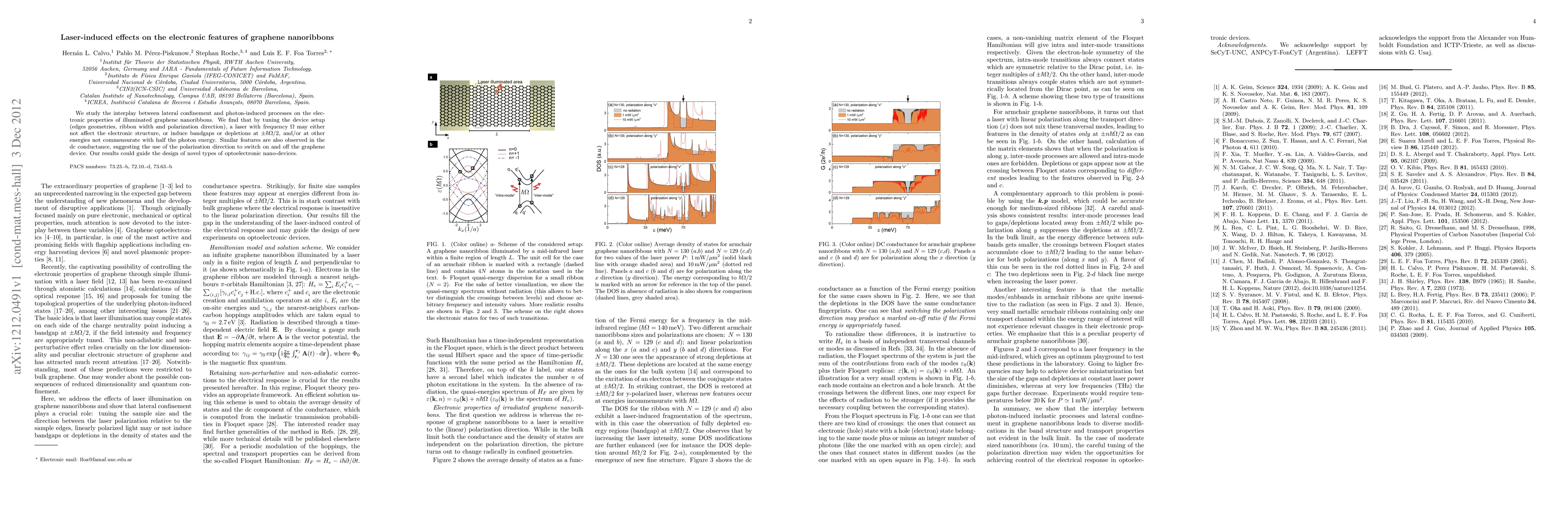 This study investigates how laser irradiation influences the electronic properties of graphene nanoribbons, revealing that device setup parameters like edge geometry and ribbon width can determine whether the laser induces bandgaps or depletions at specific energies, potentially enabling the control of graphene devices via polarization direction. These findings may inform the design of advanced optoelectronic nano-devices.