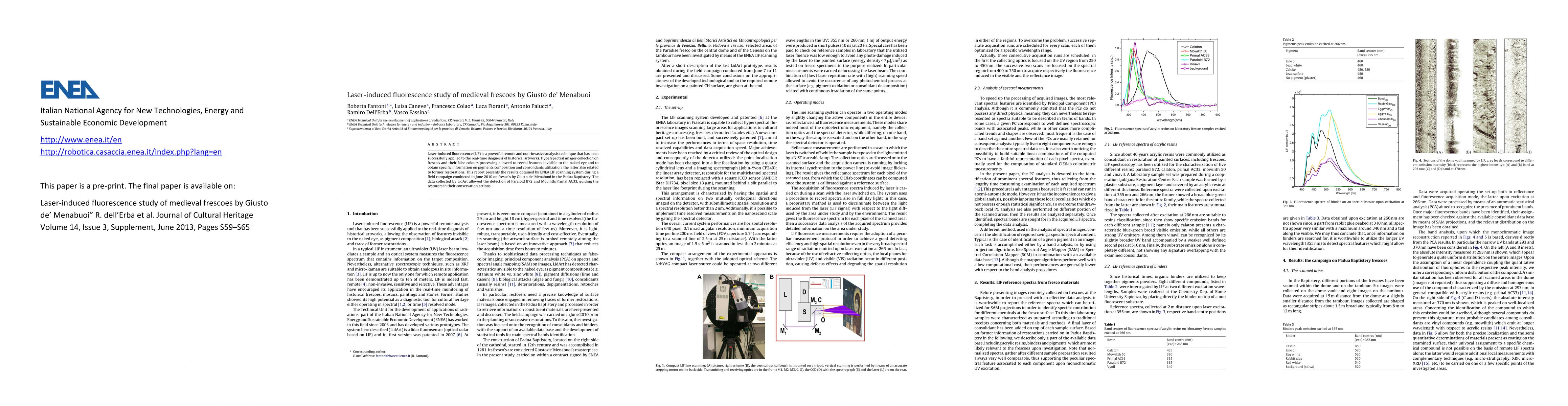 Laser induced fluorescence (LIF) is a powerful remote and non-invasive analysis technique that has been successfully applied to the real-time diagnosis of historical artworks. Hyperspectral images collection on fresco' s and their false colours processing allowed to reveal features invisible to the naked eye and to obtain specific information on pigments composition and consolidants utilization, the latter also related to former restorations. This report presents the results obtained by ENEA LIF scanning system during a field campaign conducted in June 2010 on fresco's by Giusto de' Menabuoi in the Padua Baptistery. The data collected by LidArt allowed the detection of Paraloid B72 and Movilith/Primal AC33, guiding the restorers in their conservation actions.