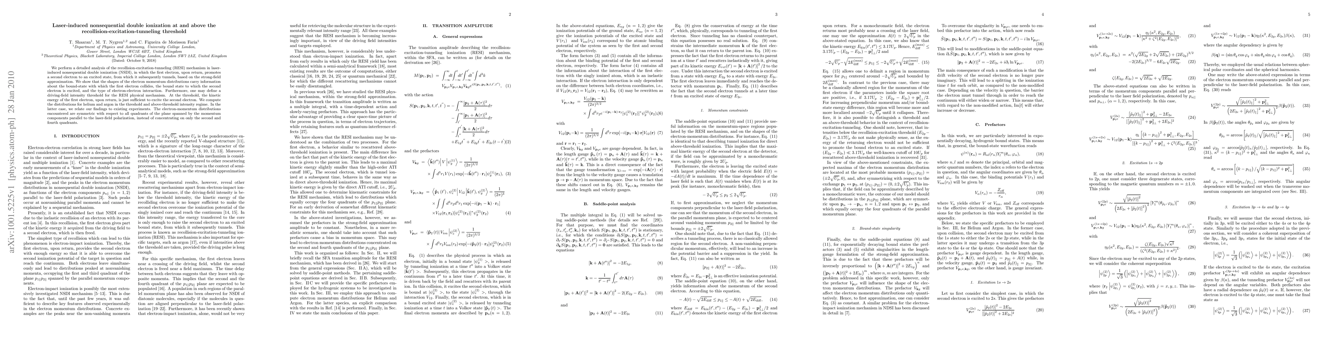 We perform a detailed analysis of the recollision-excitation-tunneling (RESI) mechanism in laser-induced nonsequential double ionization (NSDI), in which the first electron, upon return, promotes a second electron to an excited state, from which it subsequently tunnels, based on the strong-field approximation. We show that the shapes of the electron momentum distributions carry information about the bound-state with which the first electron collides, the bound state to which the second electron is excited, and the type of electron-electron interaction. Furthermore, one may define a driving-field intensity threshold for the RESI physical mechanism. At the threshold, the kinetic energy of the first electron, upon return, is just sufficient to excite the second electron. We compute the distributions for helium and argon in the threshold and above-threshold intensity regime. In the latter case, we relate our findings to existing experiments. The electron-momentum distributions encountered are symmetric with respect to all quadrants of the plane spanned by the momentum components parallel to the laser-field polarization, instead of concentrating on only the second and fourth quadrants.