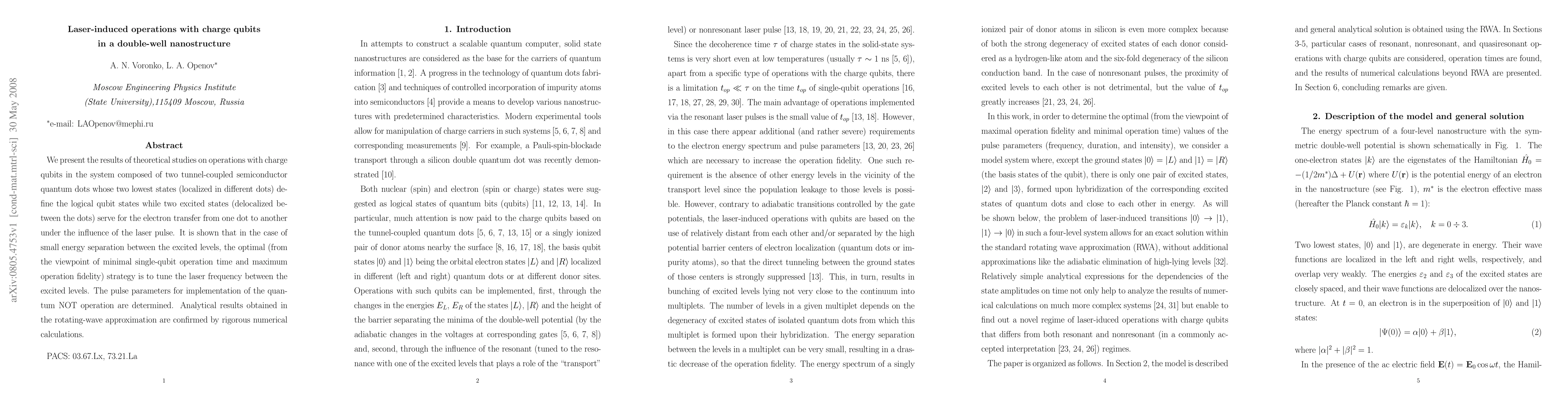 Researchers studied laser-induced operations on charge qubits in a double-well nanostructure, finding that tuning the laser frequency between excited levels yields optimal operation times and fidelity for quantum NOT operations.