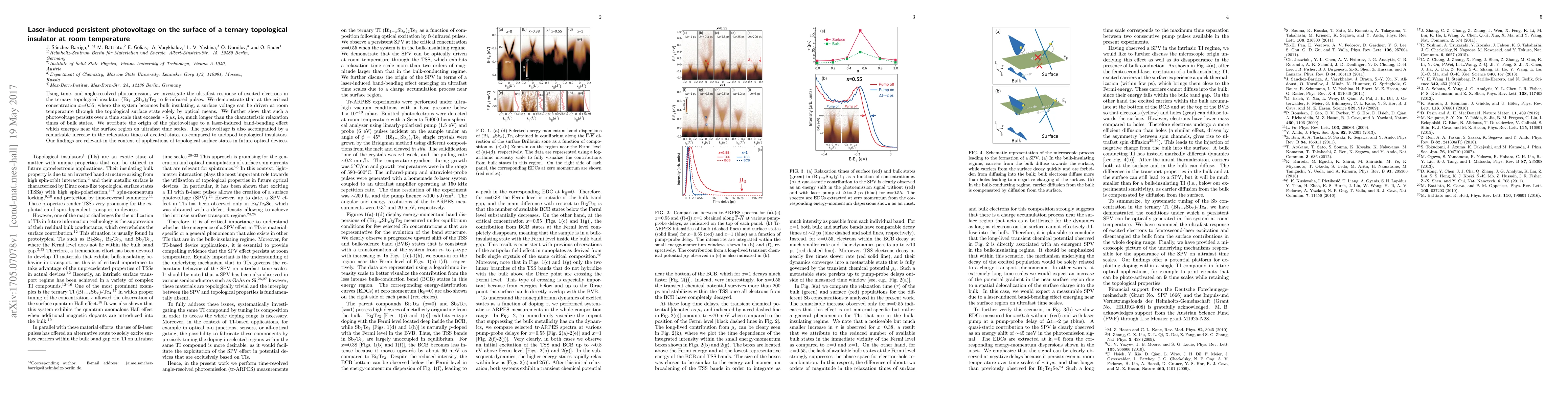 Using time- and angle-resolved photoemission, we investigate the ultrafast response of excited electrons in the ternary topological insulator (Bi$_{1 x}$Sb$_{x}$)$_2$Te$_3$ to fs-infrared pulses. We demonstrate that at the critical concentration $x$=0.55, where the system becomes bulk insulating, a surface voltage can be driven at room temperature through the topological surface state solely by optical means. We further show that such a photovoltage persists over a time scale that exceeds $\sim$6 $\mu$s, i.e, much longer than the characteristic relaxation times of bulk states. We attribute the origin of the photovoltage to a laser-induced band-bending effect which emerges near the surface region on ultrafast time scales. The photovoltage is also accompanied by a remarkable increase in the relaxation times of excited states as compared to undoped topological insulators. Our findings are relevant in the context of applications of topological surface states in future optical devices.
