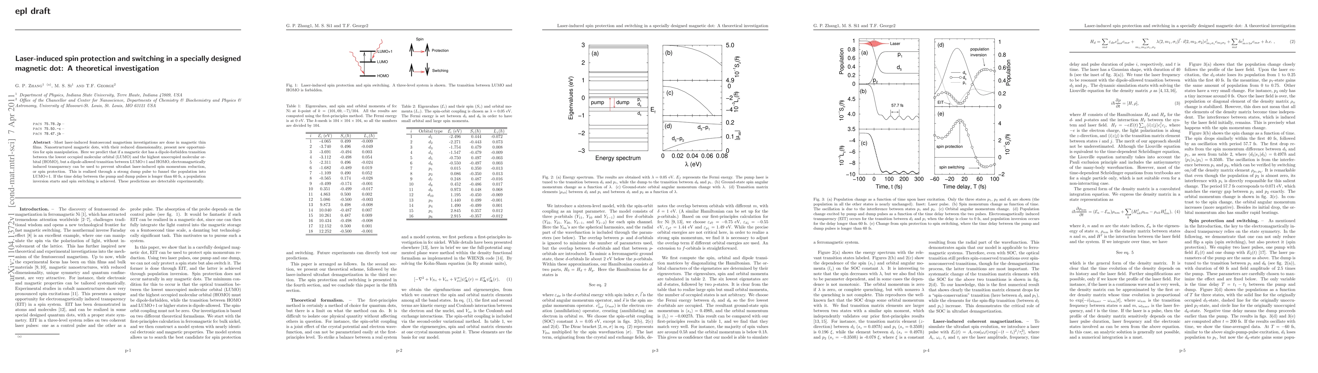 Most laser-induced femtosecond magnetism investigations are done in magnetic thin films. Nanostructured magnetic dots, with their reduced dimensionality, present new opportunities for spin manipulation. Here we predict that if a magnetic dot has a dipole-forbidden transition between the lowest occupied molecular orbital (LUMO) and the highest unoccupied molecular orbital (HOMO), but a dipole-allowed transition between LUMO+1 and HOMO, electromagnetically inducedtransparency can be used to prevent ultrafast laser-induced spin momentum reduction, or spin protection. This is realized through a strong dump pulse to funnel the population into LUMO+1. If the time delay between the pump and dump pulses is longer than 60 fs, a population inversion starts and spin switching is achieved. Thesepredictions are detectable experimentally.
