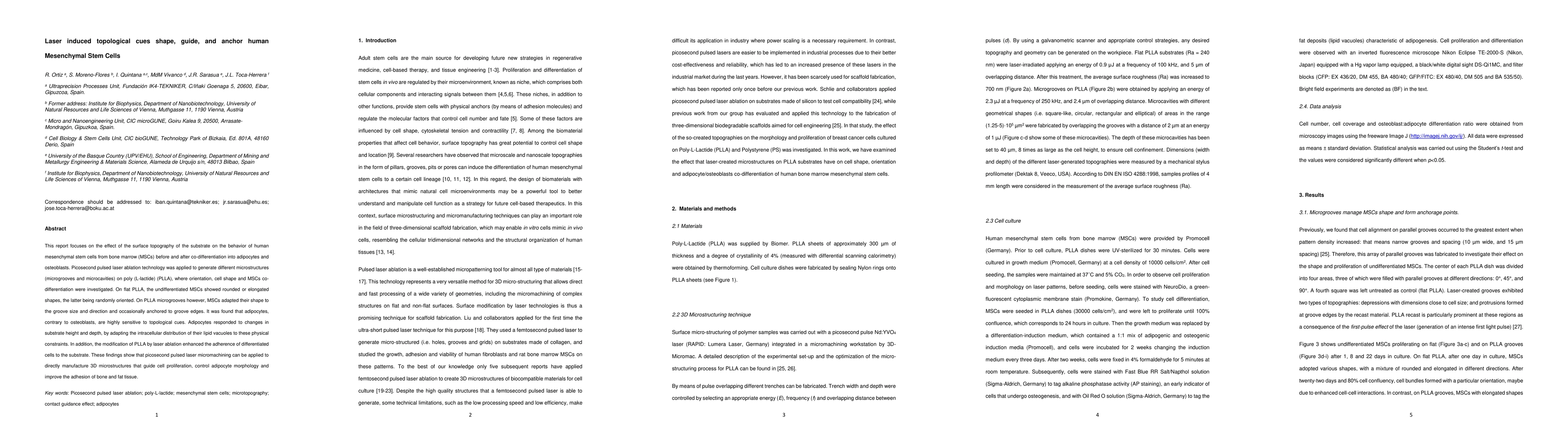 Picosecond pulsed laser ablation technology was applied to generate different microstructures (microgrooves and microcavities) on poly (L-lactide) (PLLA) to study the effect on human mesenchymal stem cells (MSCs) before and after co-differentiation into adipocytes and osteoblasts.