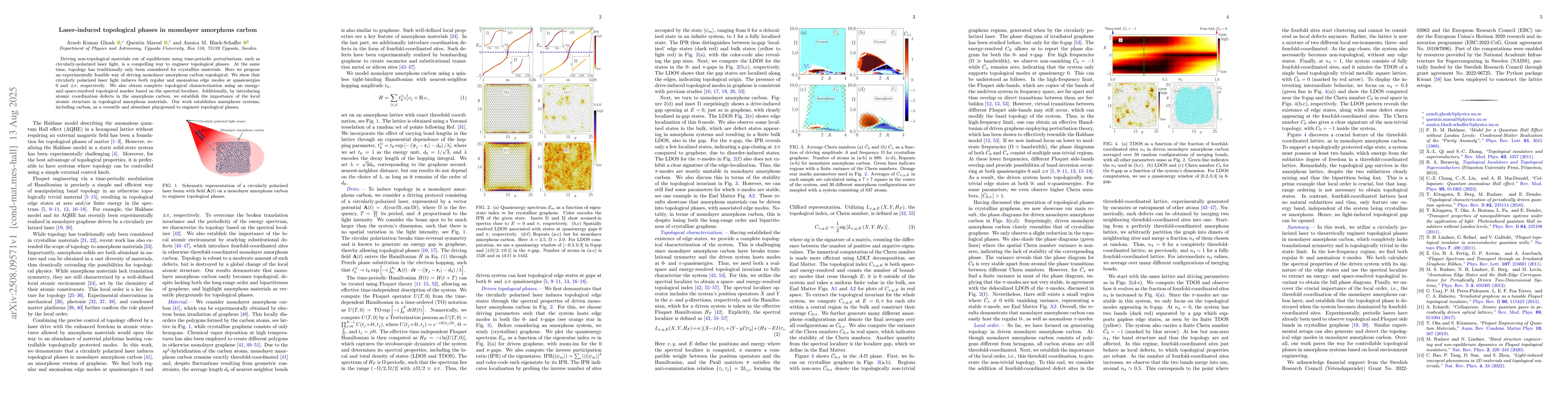 The research employs theoretical modeling using circularly-polarized laser light to drive monolayer amorphous carbon into topological phases, utilizing time-periodic perturbations and spectral localizer to characterize the system.