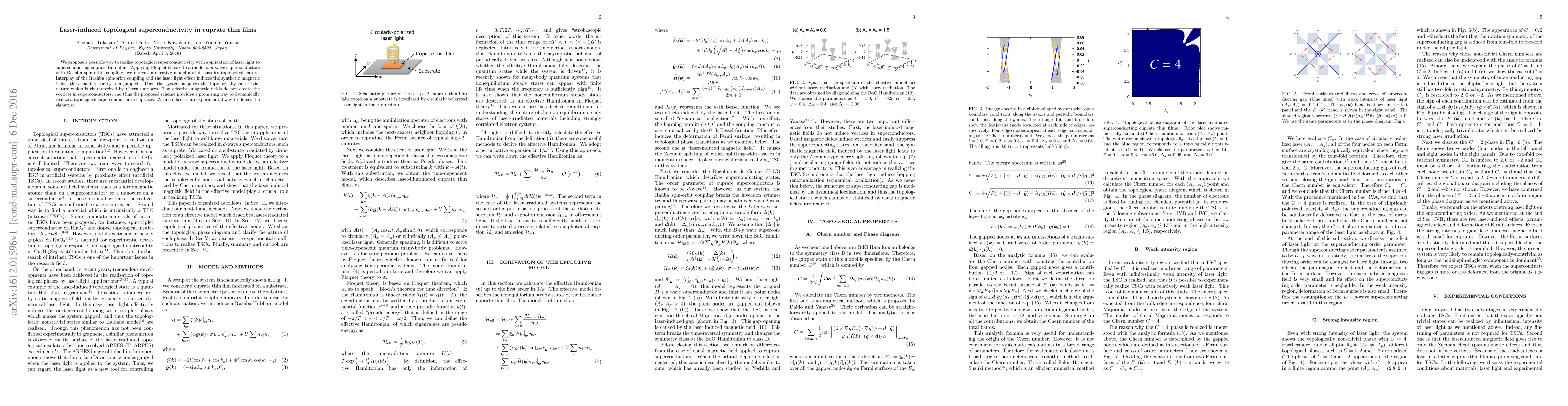 We propose a possible way to realize topological superconductivity with application of laser light to superconducting cuprate thin films. Applying Floquet theory to a model of $d$-wave superconductors with Rashba spin-orbit coupling, we derive an effective model and discuss its topological nature. Interplay of the Rashba spin-orbit coupling and the laser light effect induces the synthetic magnetic fields, thus making the system gapped. Then the system acquires the topologically non-trivial nature which is characterized by Chern numbers. The effective magnetic fields do not create the vortices in superconductors, and thus the proposed scheme provides a promising way to dynamically realize a topological superconductor in cuprates. We also discuss an experimental way to detect the signature.
