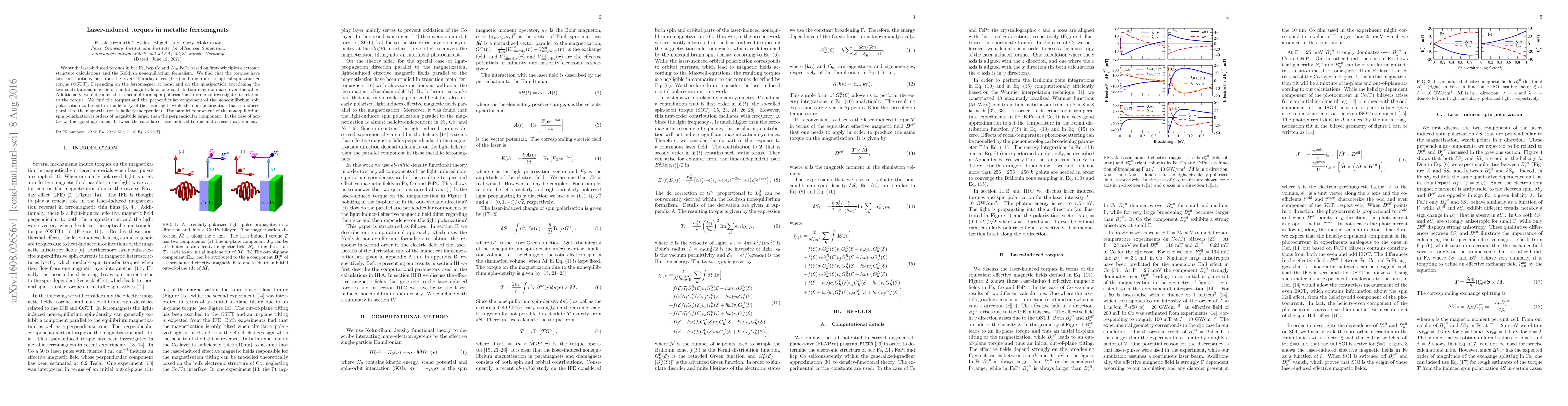 We study laser-induced torques in bcc Fe, hcp Co and $L1_0$ FePt based on first-principles electronic structure calculations and the Keldysh nonequilibrium formalism. We find that the torques have two contributions, one from the inverse Faraday effect (IFE) and one from the optical spin-transfer torque (OSTT). Depending on the ferromagnet at hand and on the quasiparticle broadening the two contributions may be of similar magnitude or one contribution may dominate over the other. Additionally, we determine the nonequilibrium spin polarization in order to investigate its relation to the torque. We find the torques and the perpendicular component of the nonequilibrium spin polarization to be odd in the helicity of the laser light, while the spin polarization that is induced parallel to the magnetization is helicity-independent. The parallel component of the nonequilibrium spin polarization is orders of magnitude larger than the perpendicular component. In the case of hcp Co we find good agreement between the calculated laser-induced torque and a recent experiment.