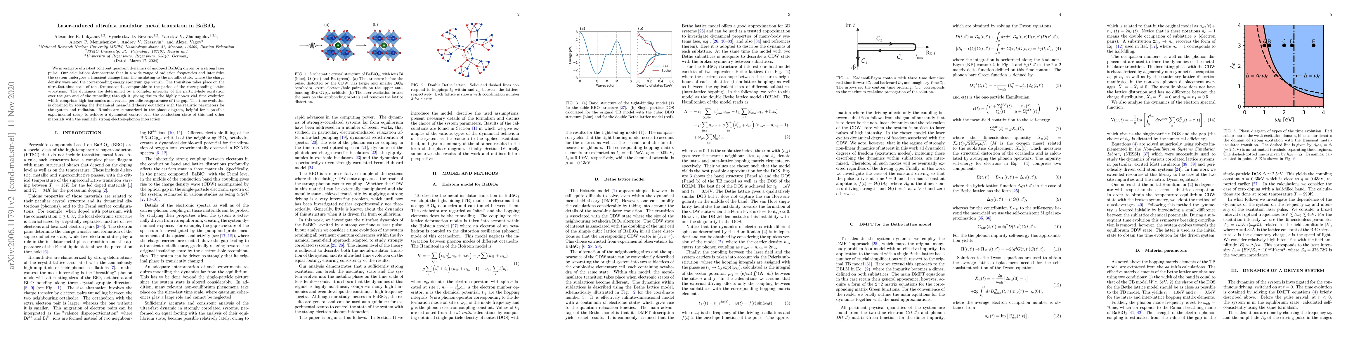 We investigate ultra-fast coherent quantum dynamics of undoped $\text{BaBiO}_{3}$ driven by a strong laser pulse. Our calculations demonstrate that in a wide range of radiation frequencies and intensities the system undergoes a transient change from the insulating to the metallic state, where the charge density wave and the corresponding energy spectrum gap vanish. The transition takes place on the ultra-fast time scale of tens femtoseconds, comparable to the period of the corresponding lattice vibrations. The dynamics are determined by a complex interplay of the particle-hole excitation over the gap and of the tunnelling through it, giving rise to the highly non-trivial time evolution which comprises high harmonics and reveals periodic reappearance of the gap. The time evolution is obtained by solving the dynamical mean-field theory equations with the realistic parameters for the system and radiation. Results are summarized in the phase diagram, helpful for a possible experimental setup to achieve a dynamical control over the conduction state of this and other materials with the similarly strong electron-phonon interaction.