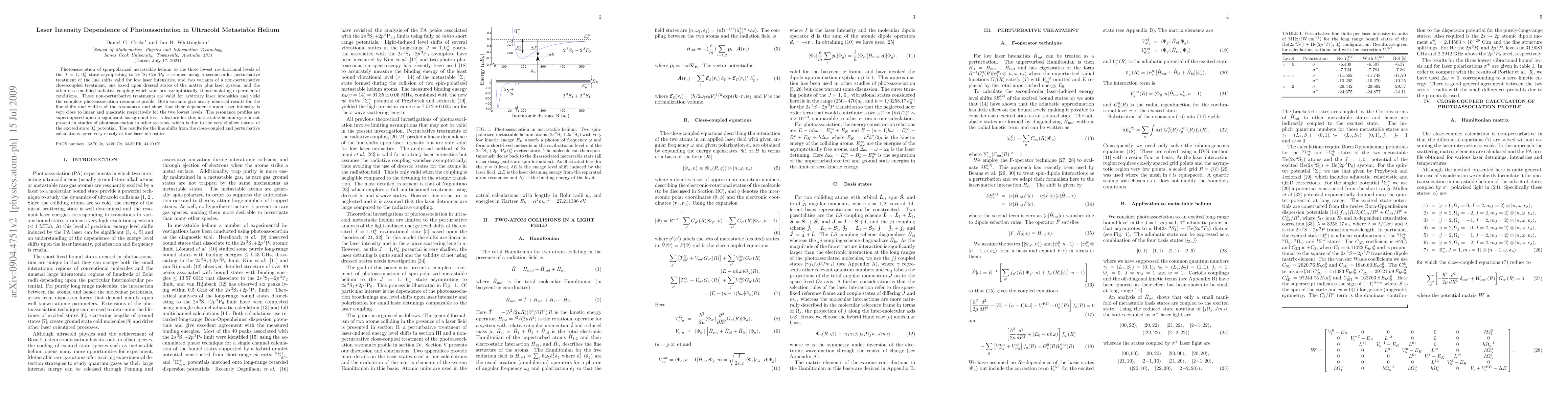 This paper investigates the photoassociation of metastable helium in the J=1, $0_u^+$ state, employing both perturbative and non-perturbative methods to analyze resonance profiles under varying laser intensities. The study finds that resonance line shifts and widths exhibit linear and quadratic dependence on laser intensity, respectively, with a notable background loss due to the shallow excited state potential.