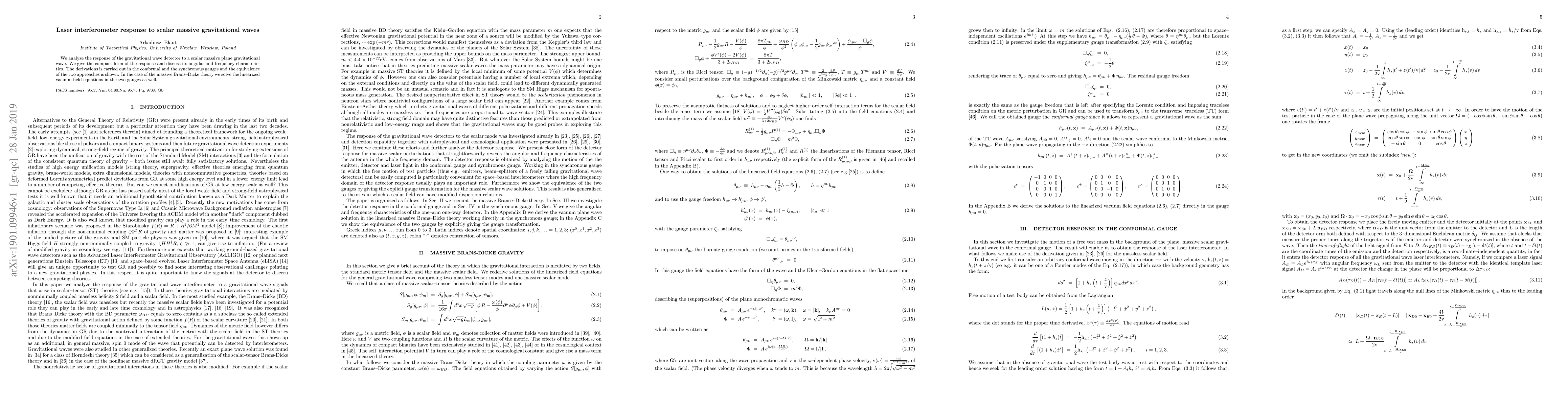 We analyze the response of the gravitational wave detector to a scalar massive plane gravitational wave. We give the compact form of the response and discuss its angular and frequency characteristics. The derivations is carried out in the conformal and the synchronous gauges and the equivalence of the two approaches is shown. In the case of the massive Brans-Dicke theory we solve the linearized vacuum field equations in the two gauges as well.