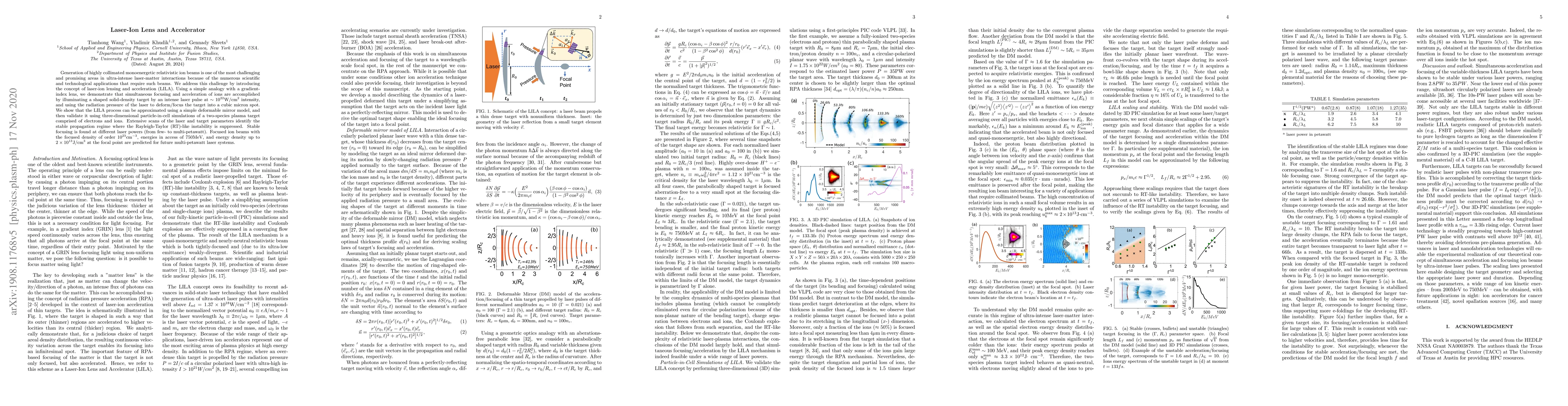 Generation of highly collimated monoenergetic relativistic ion beams is one of the most challenging and promising areas in ultra-intense laser-matter interactions because of the numerous scientific and technological applications that require such beams. We address this challenge by introducing the concept of laser-ion lensing and acceleration (LILA). Using a simple analogy with a gradient-index lens, we demonstrate that simultaneous focusing and acceleration of ions is accomplished by illuminating a shaped solid-density target by an intense laser pulse at ~10^22 W/cm^2 intensity, and using radiation pressure of the laser to deform/focus the target into a cubic micron spot. We show that the LILA process can be approximated using a simple deformable mirror model, and then validate it using three-dimensional particle-in-cell simulations of a two-species plasma target comprised of electrons and ions. Extensive scans of the laser and target parameters identify the stable propagation regime where the Rayleigh-Taylor (RT)-like instability is suppressed. Stable focusing are found at different laser powers (from few- to multi-petawatt). Focused ion beams with the focused density of order 10^23 cm^-3, energies in access of 750MeV, and energy density up to 2*10^13 J/cm^3 at the focal point are predicted for future multi-petawatt laser systems.