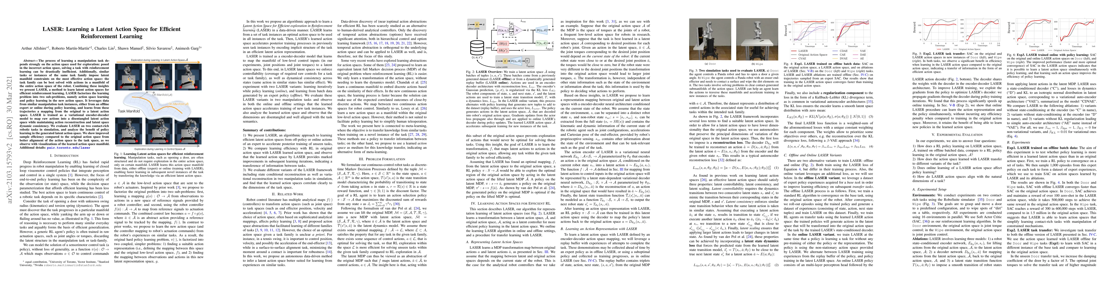 LASER is a method for learning efficient reinforcement learning by discovering latent action spaces that better align with the task's inherent constraints. It disentangles the action space through a variational encoder-decoder model, significantly improving sample efficiency on robotic manipulation tasks in simulation.