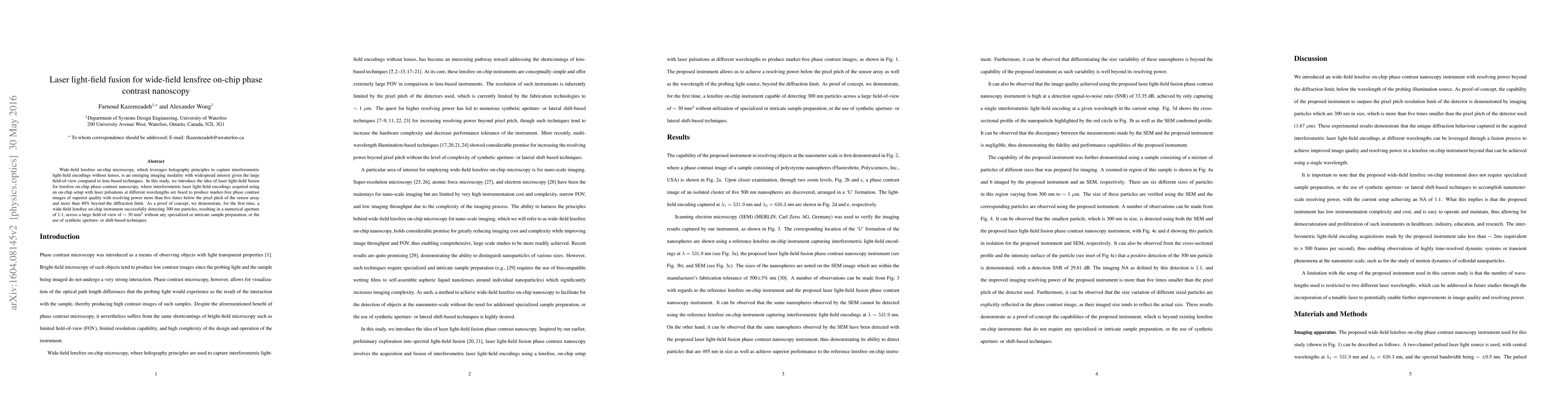 This study introduces laser light-field fusion for lensfree on-chip phase contrast nanoscopy, achieving superior quality phase contrast images with resolving power five times below pixel pitch and 40% beyond diffraction limits. The method detects 300 nm particles across a large 30 mm$^2$ field-of-view without specialized sample preparation.