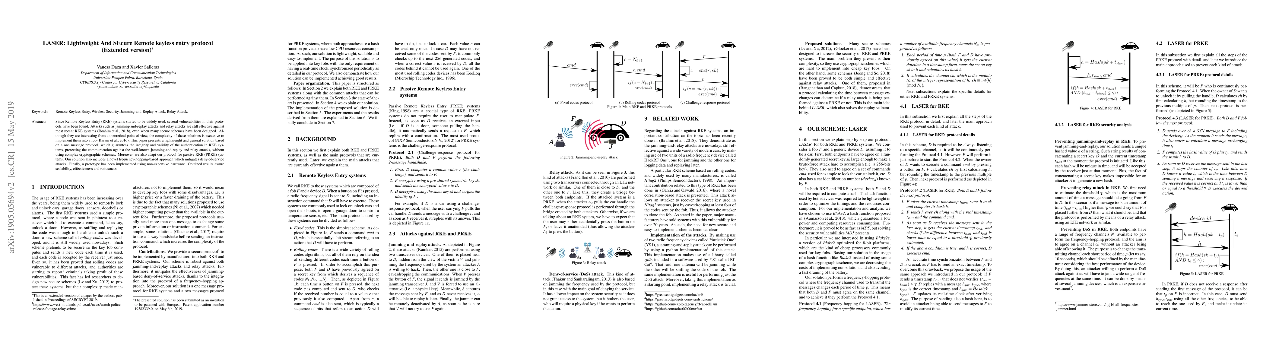 This paper proposes a lightweight and secure remote keyless entry (RKE) protocol named LASER, which effectively defends against jamming-and-replay and relay attacks using a simple one-message authentication scheme, without requiring complex cryptographic methods. The protocol also includes a frequency-hopping approach to mitigate denial-of-service attacks and has been implemented on low-cost hardware, demonstrating scalability and robustness.