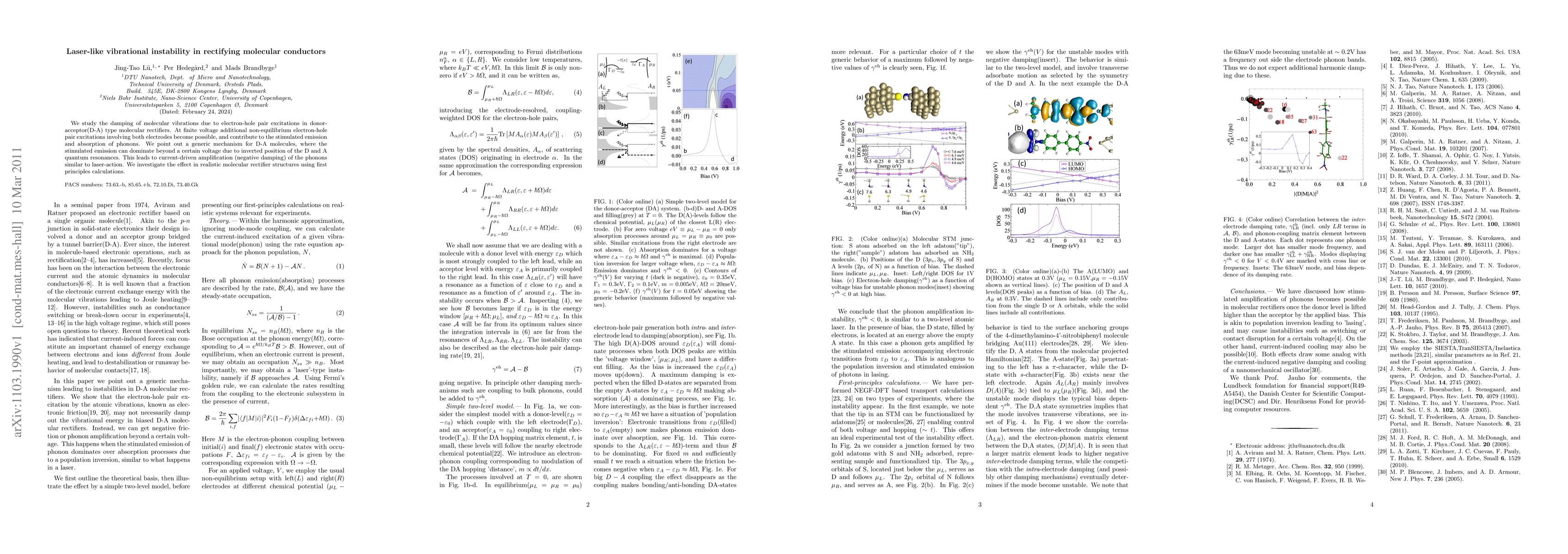 We study the damping of molecular vibrations due to electron-hole pair excitations in donor-acceptor(D-A) type molecular rectifiers. At finite voltage additional non-equilibrium electron-hole pair excitations involving both electrodes become possible, and contribute to the stimulated emission and absorption of phonons. We point out a generic mechanism for D-A molecules, where the stimulated emission can dominate beyond a certain voltage due to inverted position of the D and A quantum resonances. This leads to current-driven amplification (negative damping) of the phonons similar to laser-action. We investigate the effect in realistic molecular rectifier structures using first principles calculations.