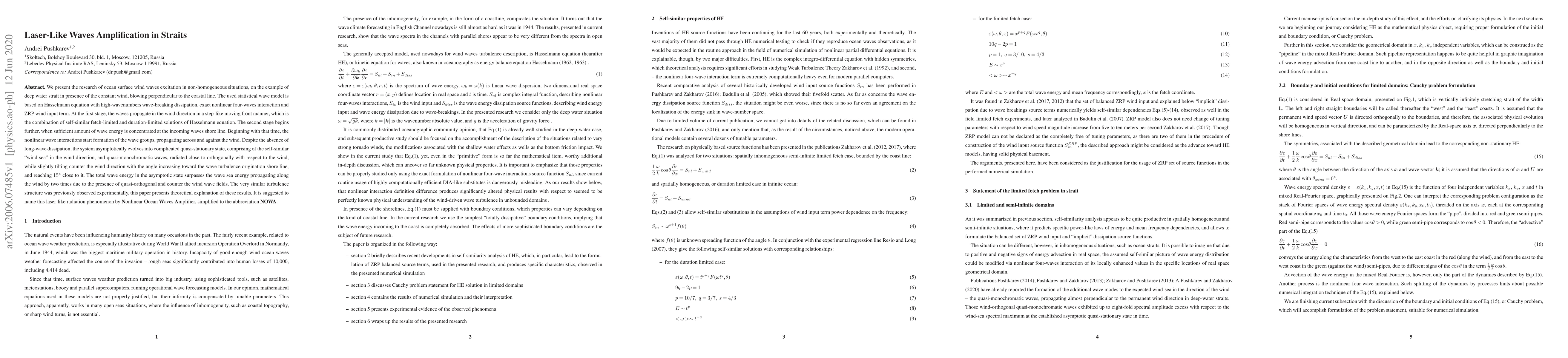 We present the research of ocean surface wind waves excitation in non-homogeneous situations, on the example of deep water strait in presence of the constant wind, blowing perpendicular to the coastal line. The used statistical wave model is based on Hasselmann equation with high-wavenumbers wave-breaking dissipation, exact nonlinear four-waves interaction and ZRP wind input term. At the first stage, the waves propagate in the wind direction in a step-like moving front manner, which is the combination of self-similar fetch-limited and duration-limited solutions of Hasselmann equation. The second stage begins further, when sufficient amount of wave energy is concentrated at the incoming waves shore line. Beginning with that time, the nonlinear wave interactions start formation of the wave groups, propagating across and against the wind. Despite the absence of long-wave dissipation, the system asymptotically evolves into complicated quasi-stationary state, comprising of the self-similar ``wind sea'' in the wind direction, and quasi-monochromatic waves, radiated close to orthogonally with respect to the wind, while slightly tilting counter the wind direction with the angle increasing toward the wave turbulence origination shore line, and reaching $15^{\circ}$ close to it. The total wave energy in the asymptotic state surpasses the wave sea energy propagating along the wind by two times due to the presence of quasi-orthogonal and counter the wind wave fields. The very similar turbulence structure was previously observed experimentally, this paper presents theoretical explanation of these results. It is suggested to name this laser-like radiation phenomenon by Nonlinear Ocean Waves Amplifier, simplified to the abbreviation NOWA.