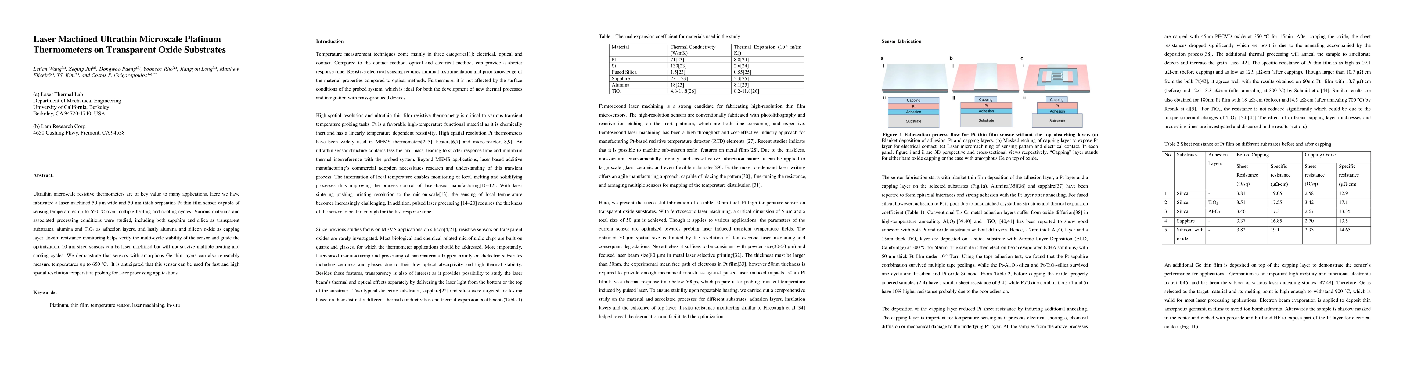 This paper details the fabrication of a laser machined, ultrathin microscale platinum thermometer on transparent oxide substrates, capable of sensing temperatures up to 650°C over multiple heating cycles. The study explores various materials and conditions, demonstrating the stability and potential for high spatial resolution temperature probing in laser processing applications.