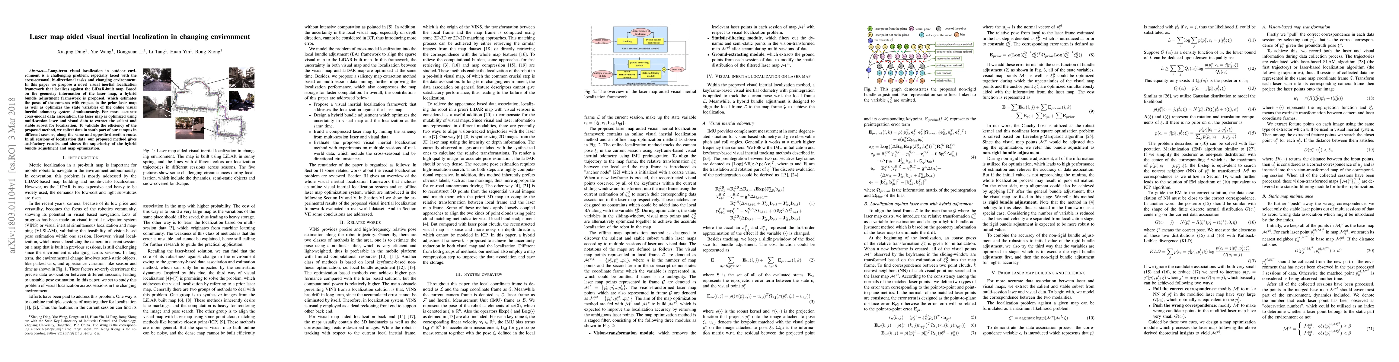 This paper proposes a visual inertial localization framework that uses a LiDAR-built map for localization in changing outdoor environments. The method employs a hybrid bundle adjustment to optimize both the camera poses and the visual inertial odometry system, while optimizing the laser map with multi-session data for better cross-modal data association. Experiments in different seasons show the method's effectiveness and accuracy.