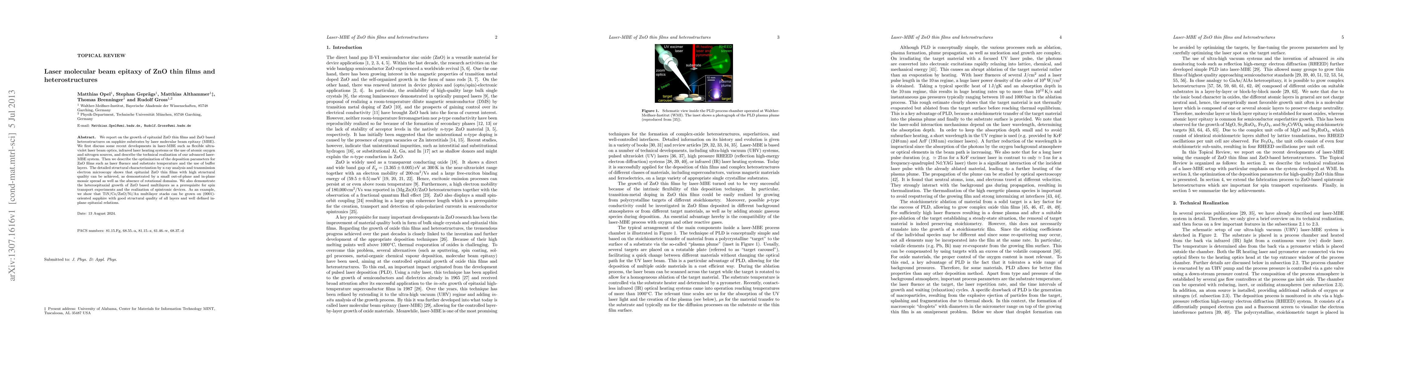 This paper details the laser molecular beam epitaxy (MBE) growth of high-quality ZnO thin films and heterostructures on sapphire substrates, highlighting advanced MBE techniques and optimized deposition parameters for superior structural quality. The study also demonstrates the successful fabrication of ZnO-based multilayer stacks for potential spintronic applications.