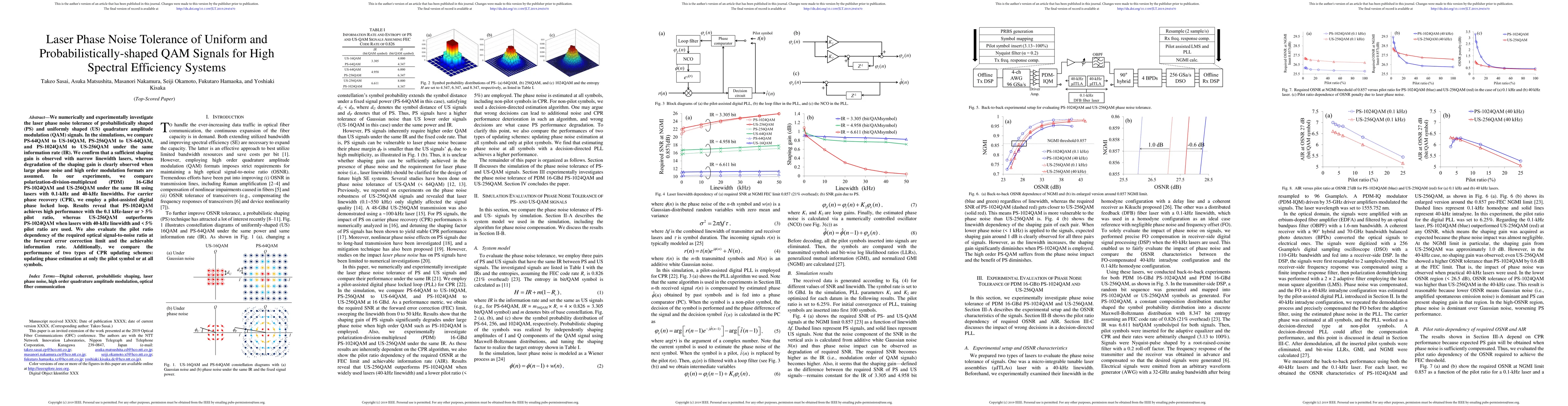 We numerically and experimentally investigate the laser phase noise tolerance of probabilistically shaped (PS) and uniformly shaped (US) quadrature amplitude modulation (QAM) signals. In the simulations, we compare PS-64QAM to US-16QAM, PS-256QAM to US-64QAM, and PS-1024QAM to US-256QAM under the same information rate (IR). We confirm that a sufficient shaping gain is observed with narrow linewidth lasers, whereas degradation of the shaping gain is clearly observed when large phase noise and high order modulation formats are assumed. In our experiments, we compare polarization-division-multiplexed (PDM) 16-GBd PS-1024QAM and US-256QAM under the same IR using lasers with 0.1-kHz and 40-kHz linewidths. For carrier phase recovery (CPR), we employ a pilot-assisted digital phase locked loop. Results reveal that PS-1024QAM achieves high performance with the 0.1 kHz-laser or > 5% pilot ratio, whereas US-256QAM outperforms PS-1024QAM when lasers with 40-kHz linewidth and < 5% pilot ratio are used. We also evaluate the pilot ratio dependency of the required optical signal-to-noise ratio at the forward error correction limit and the achievable information rate. Additionally, we compare the performance of two types of CPR updating schemes: updating phase estimation at only the pilot symbol or at all symbols.
