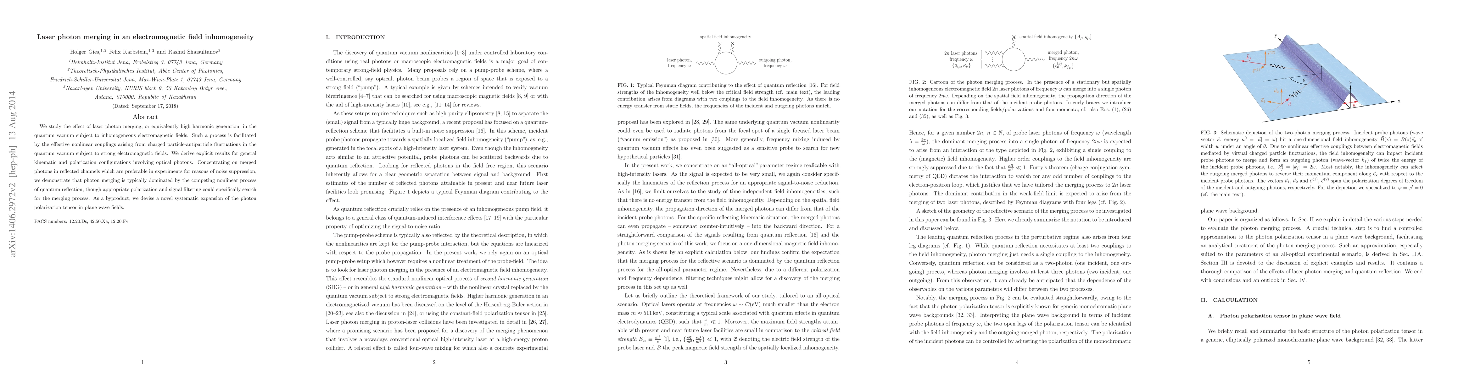 This paper investigates laser photon merging in inhomogeneous electromagnetic fields, focusing on high harmonic generation in the quantum vacuum. It finds that photon merging is often overshadowed by quantum reflection but suggests that specific polarization and signal filtering could enhance detection of the merging process.