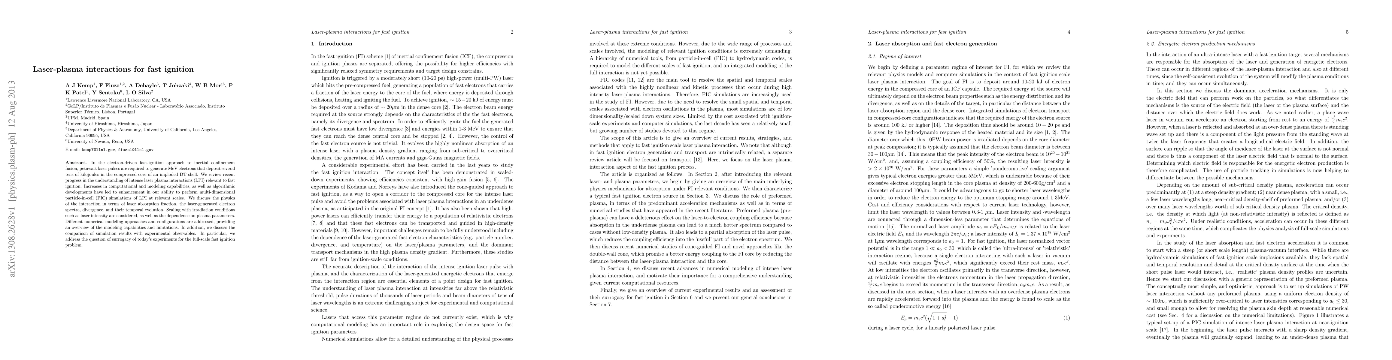 This paper reviews recent advances in understanding laser-plasma interactions (LPI) crucial for fast ignition in inertial confinement fusion, focusing on multi-dimensional simulations and modeling of laser-generated electron spectra and their impact on fusion ignition. It also discusses the comparison of simulation results with experimental data and the surrogacy of current experiments for full-scale fast ignition.