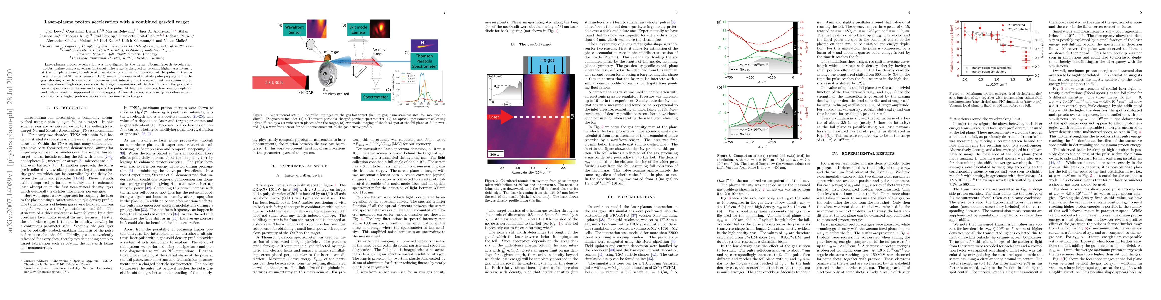 This paper investigates laser-plasma proton acceleration using a gas-foil target, achieving higher laser intensities through self-focusing in the gas layer. Experimental results show that maximum proton energies are highly dependent on the laser energy transmission through the gas, with self-focusing at low densities yielding comparable or higher proton energies.