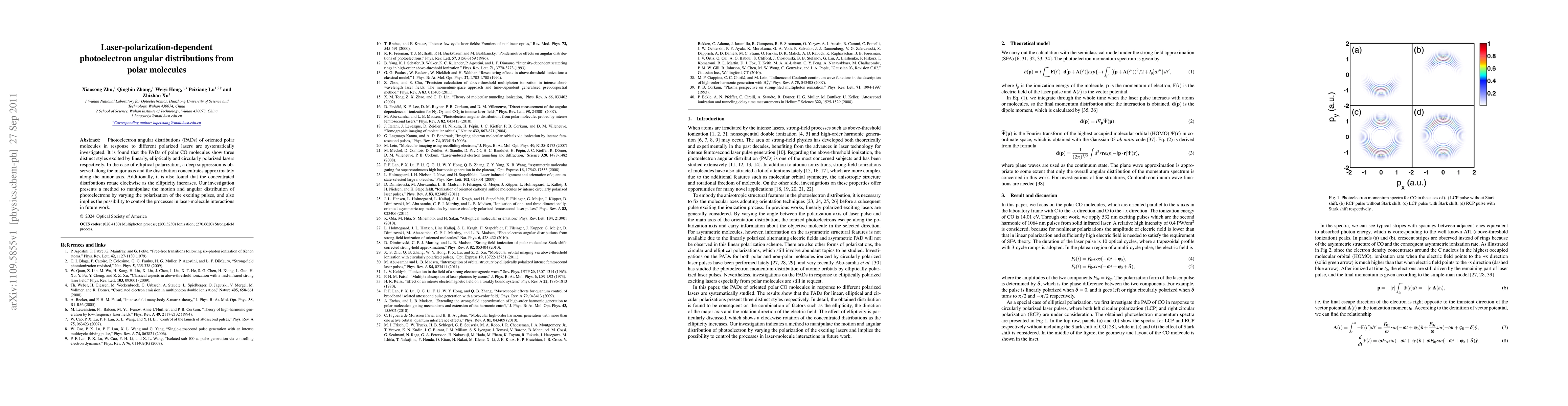 This study investigates the laser-polarization-dependent photoelectron angular distributions (PADs) from oriented polar CO molecules, revealing distinct PADs for linear, elliptical, and circular polarizations. Notably, elliptical polarization suppresses electron distribution along the major axis and concentrates it along the minor axis, with rotation as ellipticity increases, suggesting a method to manipulate photoelectron motion and potential control over laser-molecule interactions.