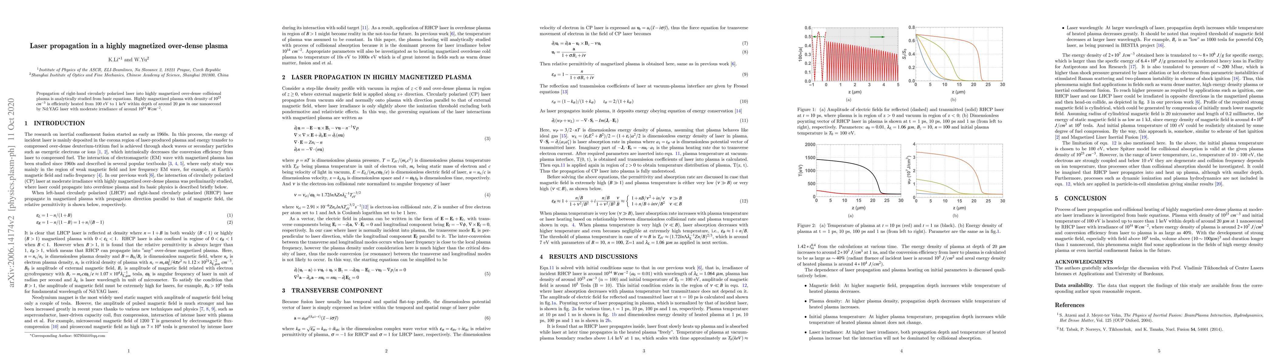 This paper analytically investigates the propagation of right-hand circularly polarized laser in highly magnetized over-dense plasma, demonstrating efficient heating from 100 eV to 1 keV within 20 μm in one nanosecond using a Nd:YAG laser at moderate irradiance.