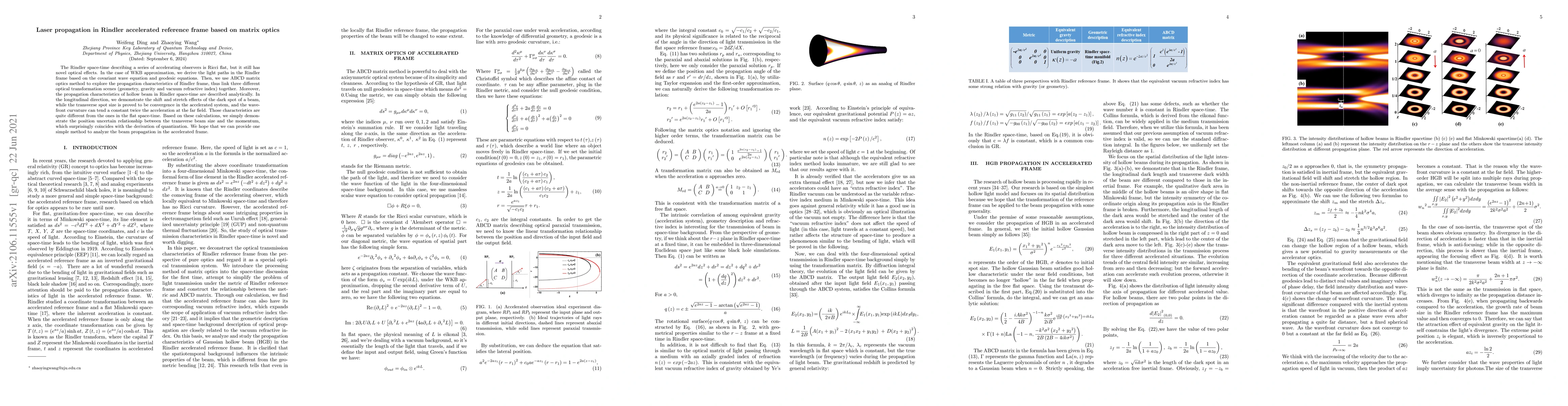 This paper investigates laser propagation in Rindler spacetime using matrix optics, deriving light geodesics via the WKB approximation and exploring the unique optical effects in an accelerating frame. It links geometry, gravity, and vacuum refractive index through ABCD matrix optics, revealing distinct propagation characteristics for hollow beams compared to flat spacetime.