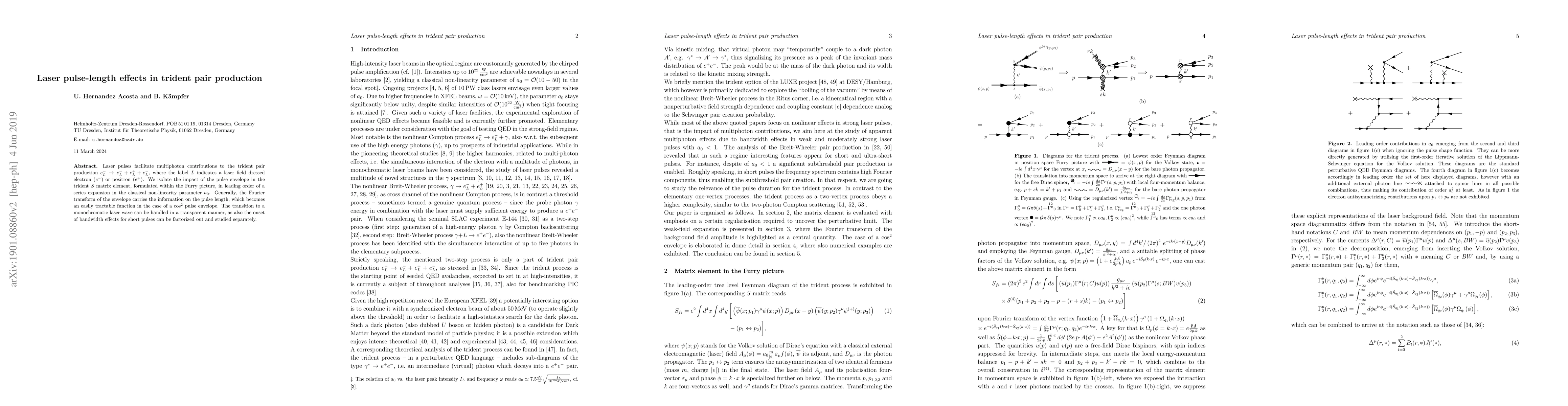 This paper investigates how laser pulse lengths affect trident pair production, isolating the pulse envelope's impact on the S matrix element within the Furry picture. It simplifies the analysis for $\cos^2$ pulse envelopes and discusses the transition to monochromatic waves and bandwidth effects for short pulses.