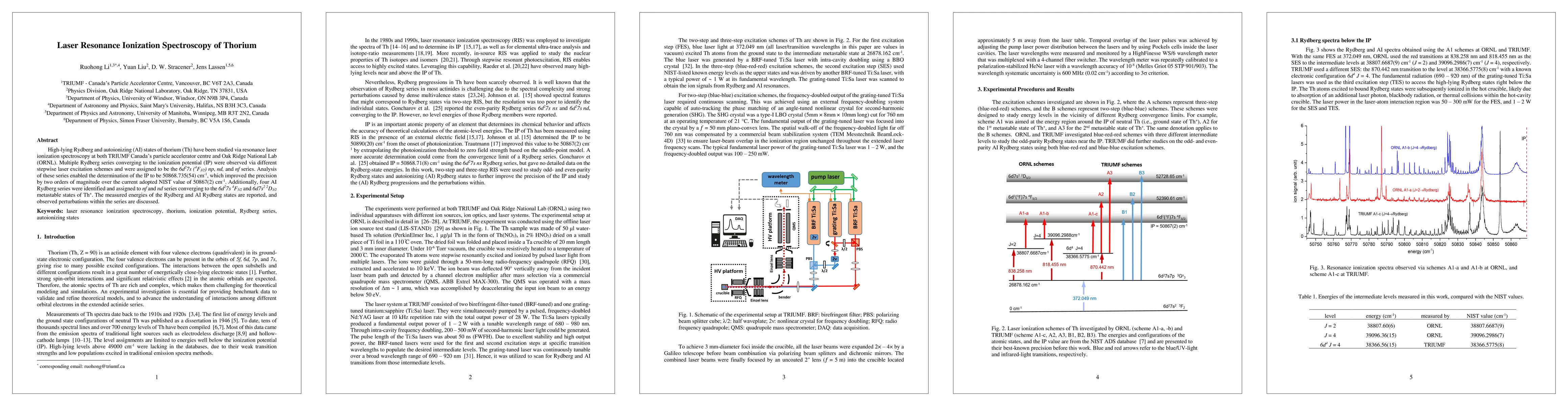 High-lying Rydberg and autoionizing (AI) states of thorium (Th) have been studied via resonance laser ionization spectroscopy at both TRIUMF Canada's particle accelerator centre and Oak Ridge National Lab (ORNL). Multiple Rydberg series converging to the ionization potential (IP) were observed via different stepwise laser excitation schemes and were assigned to be the $6d^27s (^4F_{3/2})$ $np$, $nd$, and $nf$ series. Analysis of these series enabled the determination of the IP to be 50868.735(54) cm$^{-1}$, which improved the precision by two orders of magnitude over the current adopted NIST value of 50867(2) cm$^{-1}$. Additionally, four AI Rydberg series were identified and assigned to $nf$ and $nd$ series converging to the $6d^27s$ $^4F_{5/2}$ and $6d^27s$ $^2D_{3/2}$ metastable states of Th$^+$. The measured energies of the Rydberg and AI Rydberg states are reported, and observed perturbations within the series are discussed.