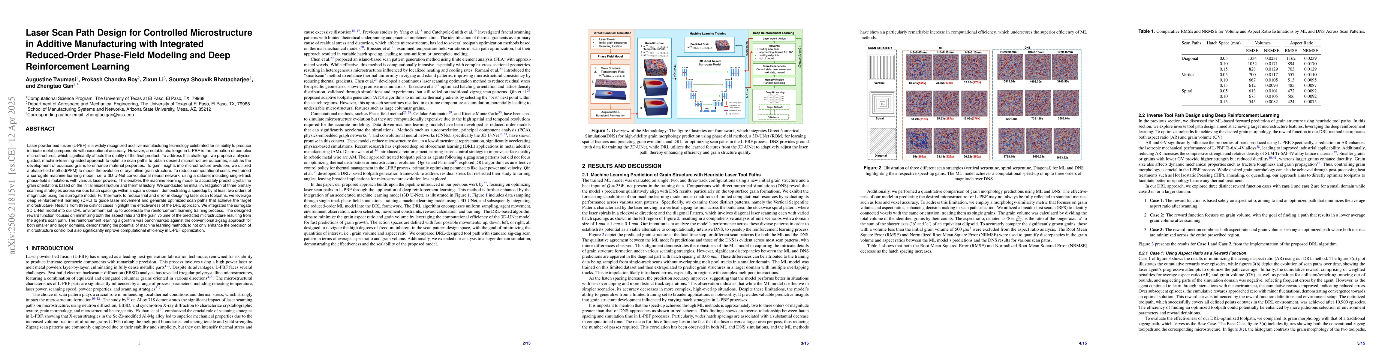 Laser powder bed fusion (L-PBF) is a widely recognized additive manufacturing technology for producing intricate metal components with exceptional accuracy. A key challenge in L-PBF is the formation of complex microstructures affecting product quality. We propose a physics-guided, machine-learning approach to optimize scan paths for desired microstructure outcomes, such as equiaxed grains. We utilized a phase-field method (PFM) to model crystalline grain structure evolution. To reduce computational costs, we trained a surrogate machine learning model, a 3D U-Net convolutional neural network, using single-track phase-field simulations with various laser powers to predict crystalline grain orientations based on initial microstructure and thermal history. We investigated three scanning strategies across various hatch spacings within a square domain, achieving a two-orders-of-magnitude speedup using the surrogate model. To reduce trial and error in designing laser scan toolpaths, we used deep reinforcement learning (DRL) to generate optimized scan paths for target microstructure. Results from three cases demonstrate the DRL approach's effectiveness. We integrated the surrogate 3D U-Net model into our DRL environment to accelerate the reinforcement learning training process. The reward function minimizes both aspect ratio and grain volume of the predicted microstructure from the agent's scan path. The reinforcement learning algorithm was benchmarked against conventional zigzag approach for smaller and larger domains, showing machine learning methods' potential to enhance microstructure control and computational efficiency in L-PBF optimization.