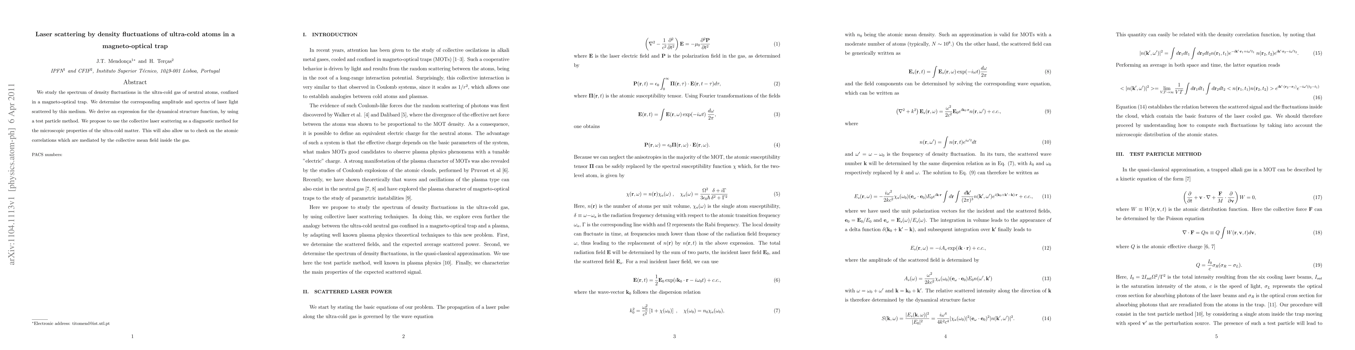 We study the spectrum of density fluctuations in the ultra-cold gas of neutral atoms, confined in a magneto-optical trap. We determine the corresponding amplitude and spectra of laser light scattered by this medium. We derive an expression for the dynamical structure function, by using a test particle method. We propose to use the collective laser scattering as a diagnostic method for the microscopic properties of the ultra-cold matter. This will also allow us to check on the atomic correlations which are mediated by the collective mean field inside the gas.