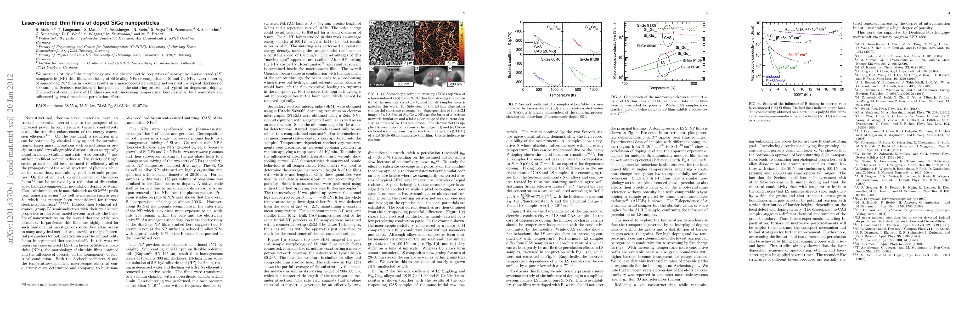 We present a study of the morphology and the thermoelectric properties of short-pulse laser-sintered (LS) nanoparticle (NP) thin films, consisting of SiGe alloy NPs or composites of Si and Ge NPs. Laser-sintering of spin-coated NP films in vacuum results in a macroporous percolating network with a typical thickness of 300 nm. The Seebeck coefficient is independent of the sintering process and typical for degenerate doping. The electrical conductivity of LS films rises with increasing temperature, best described by a power-law and influenced by two-dimensional percolation effects.