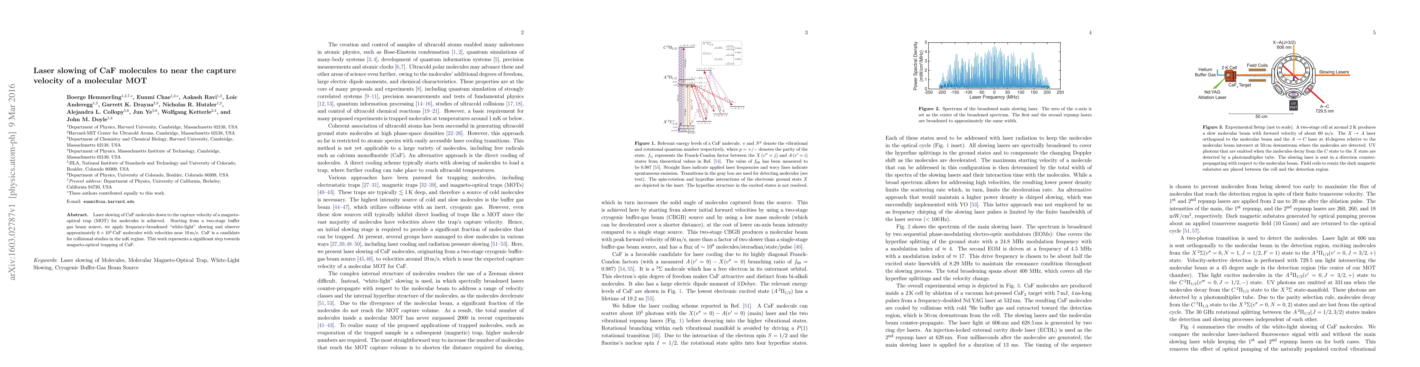 This paper reports the successful laser slowing of CaF molecules to near the capture velocity of a magneto-optical trap (MOT), achieving approximately 6x10^4 molecules with velocities around 10 m/s, using a two-stage buffer gas beam source and frequency-broadened "white-light" slowing. This advancement paves the way for further collisional studies of CaF at millikelvin temperatures.