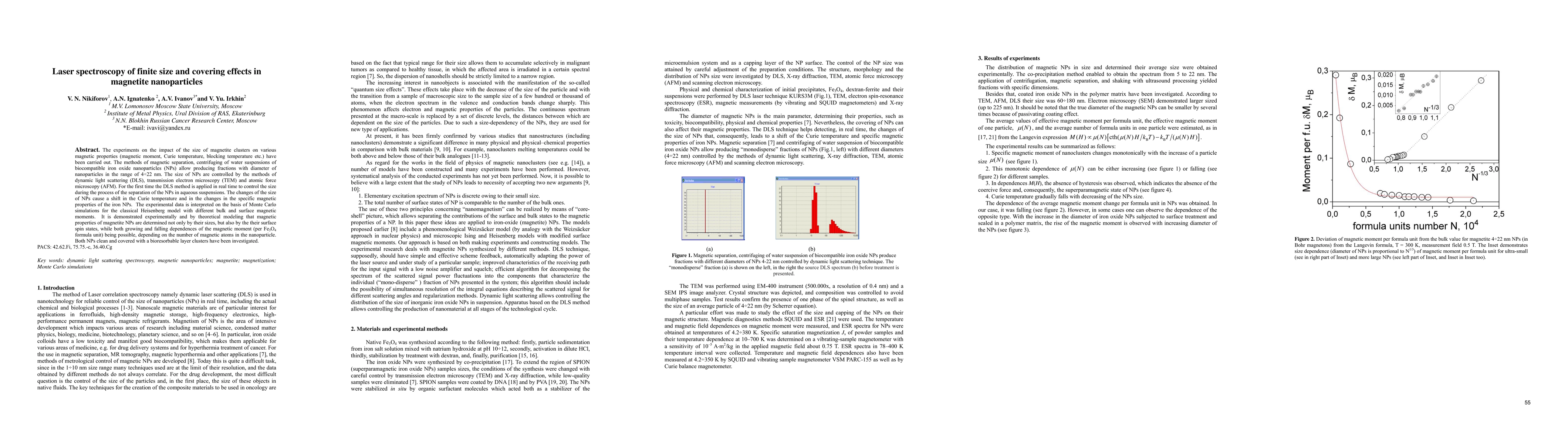 The experiments on the impact of the size of magnetite clusters on various magnetic properties (magnetic moment, Curie temperature, blocking temperature etc.) have been carried out. The methods of magnetic separation, centrifuging of water suspensions of biocompatible iron oxide nanoparticles (NPs) allow producing fractions with diameter of nanoparticles in the range of 4{\div}22 nm. The size of NPs are controlled by the methods of dynamic light scattering (DLS), transmission electron microscopy (TEM) and atomic force microscopy (AFM). For the first time the DLS method is applied in real time to control the size during the process of the separation of the NPs in aqueous suspensions. The changes of the size of NPs cause a shift in the Curie temperature and in the changes in the specific magnetic properties of the iron NPs. The experimental data is interpreted on the basis of Monte Carlo simulations for the classical Heisenberg model with different bulk and surface magnetic moments. It is demonstrated experimentally and by theoretical modeling that magnetic properties of magnetite NPs are determined not only by their sizes, but also by the their surface spin states, while both growing and falling dependences of the magnetic moment (per Fe3O4 formula unit) being possible, depending on the number of magnetic atoms in the nanoparticle. Both NPs clean and covered with a bioresorbable layer clusters have been investigated.