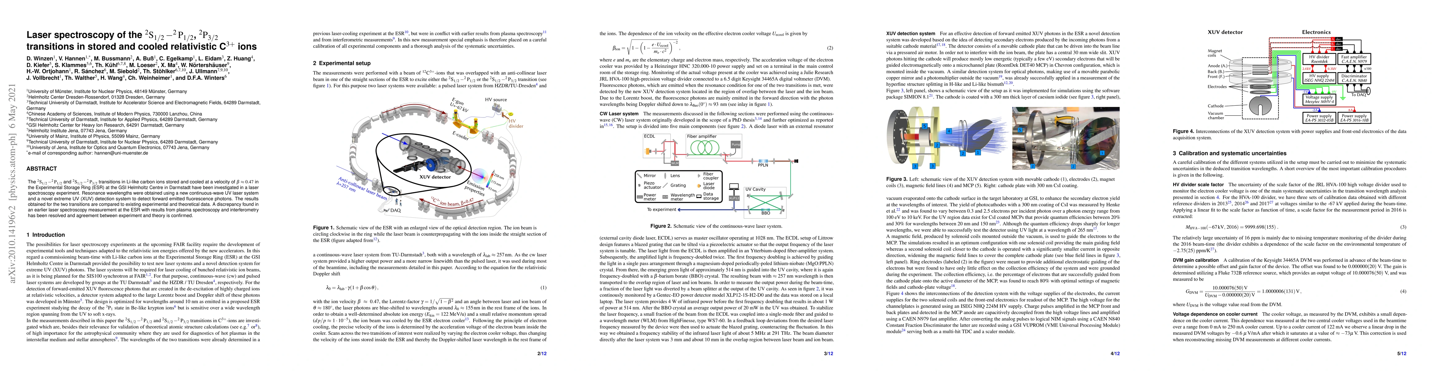 This paper reports on laser spectroscopy of Li-like carbon ions in the ESR, resolving discrepancies in earlier measurements by using a new UV laser system and XUV detection, confirming agreement between experimental and theoretical results for $^2S_{1/2} - ^2P_{1/2}$ and $^2S_{1/2} - ^2P_{3/2}$ transitions.