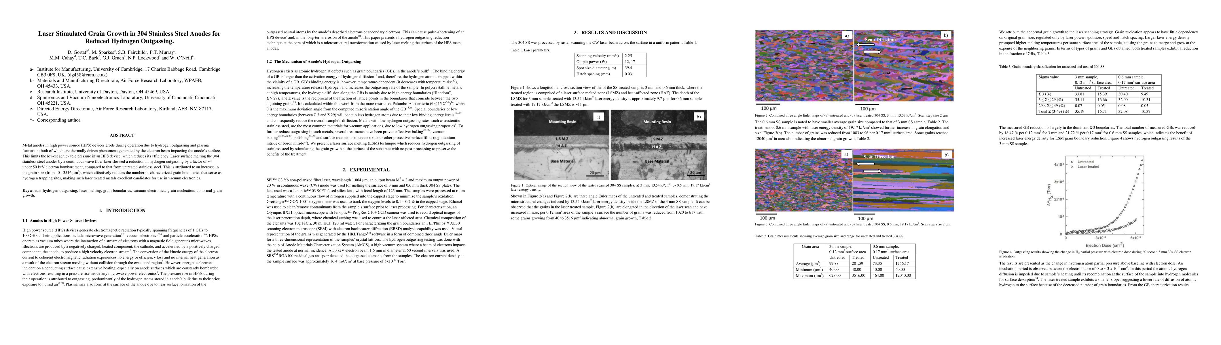 This study investigates laser surface melting of 304 stainless steel anodes to reduce hydrogen outgassing, finding a fourfold decrease in outgassing under electron bombardment due to increased grain size, which minimizes hydrogen trapping sites.