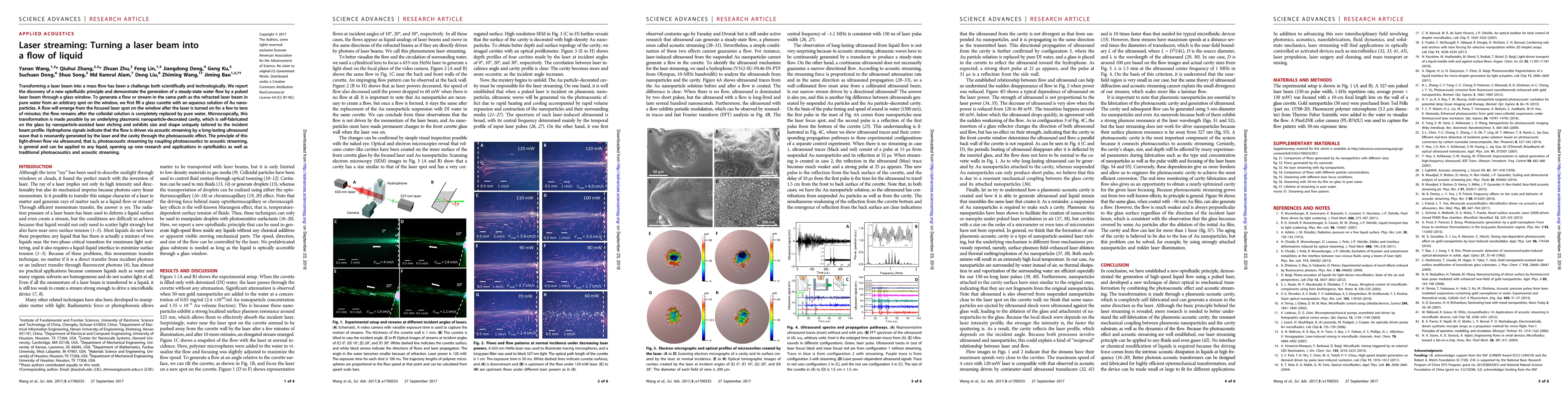 Transforming a laser beam into a mass flow has been a challenge both scientifically and technologically. Here we report the discovery of a new optofluidics principle and demonstrate the generation of a steady-state water flow by a pulsed laser beam through a glass window. In order to generate a flow or stream in the same path as the refracted laser beam in pure water from an arbitrary spot on the window, we first fill a glass cuvette with an aqueous solution of Au nanoparticles. A flow will emerge from the focused laser spot on the window after the laser is turned on for a few to tens of minutes, the flow remains after the colloidal solution is completely replaced by pure water. Microscopically, this transformation is made possible by an underlying plasmonic nanoparticle-decorated cavity which is self-fabricated on the glass by nanoparticle-assisted laser etching and exhibits size and shape uniquely tailored to the incident beam profile. Hydrophone signals indicate that the flow is driven via acoustic streaming by a long-lasting ultrasound wave that is resonantly generated by the laser and the cavity through the photoacoustic effect. The principle of this light-driven flow via ultrasound, i.e. photoacoustic streaming by coupling photoacoustics to acoustic streaming, is general and can be applied to any liquids, opening up new research and applications in optofluidics as well as traditional photoacoustics and acoustic streaming.