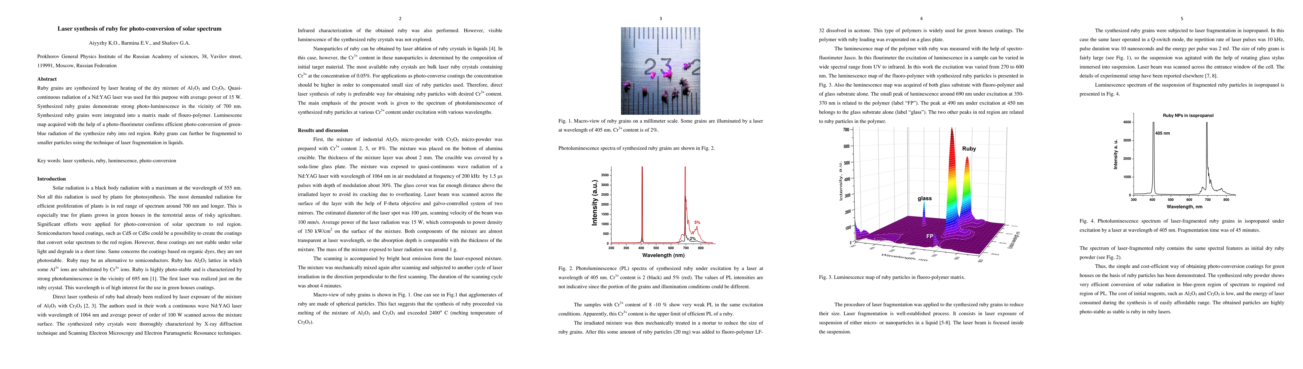 Ruby grains are synthesized by laser heating of the dry mixture of Al$_2$O$_3$ and Cr$_2$O$_3$. Quasi-continuous radiation of a Nd:YAG laser was used for this purpose with average power of 15 W. Synthesized ruby grains demonstrate strong photo-luminescence in the vicinity of 700 nm. Synthesized ruby grains were integrated into a matrix made of flouro-polymer. Luminescene map acquired with the help of a photo-fluorimeter confirms efficient photo-conversion of green-blue radiation of the synthesize ruby into red region. Ruby grans can further be fragmented to smaller particles using the technique of laser fragmentation in liquids.