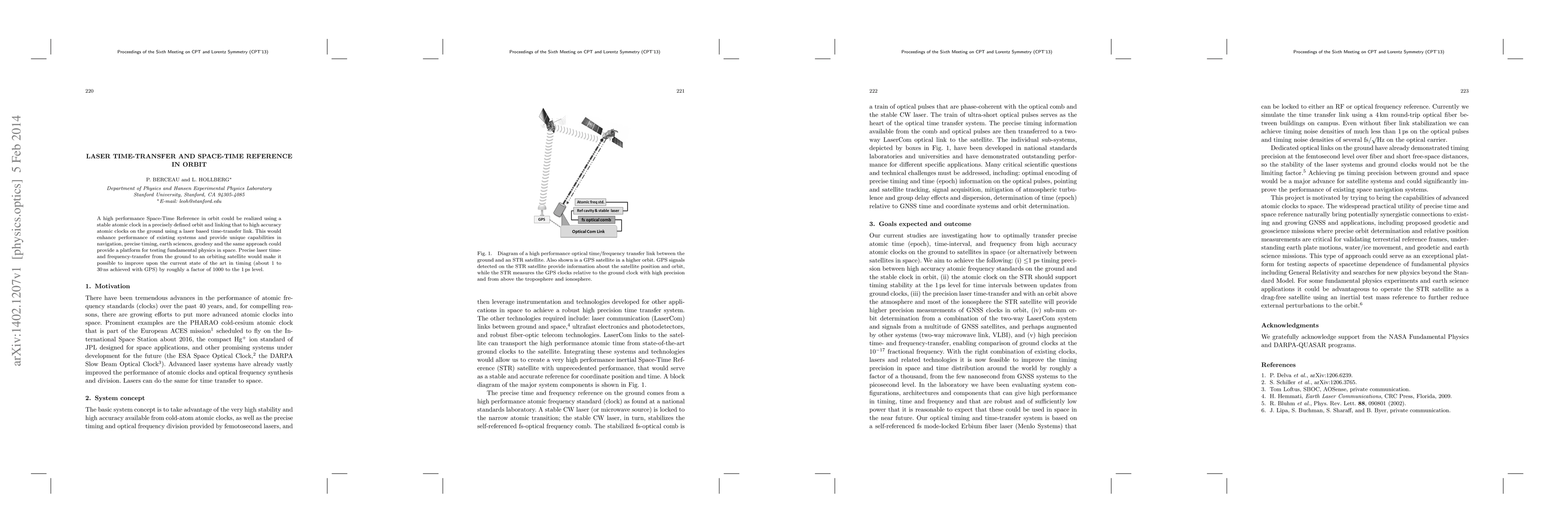 A high performance Space-Time Reference in orbit could be realized using a stable atomic clock in a precisely defined orbit and linking that to high accuracy atomic clocks on the ground using a laser based time-transfer link. This would enhance performance of existing systems and provide unique capabilities in navigation, precise timing, earth sciences, geodesy and the same approach could provide a platform for testing fundamental physics in space. Precise laser time- and frequency-transfer from the ground to an orbiting satellite would make it possible to improve upon the current state of the art in timing (about 1 to 30 ns achieved with GPS) by roughly a factor of 1000 to the 1 ps level.