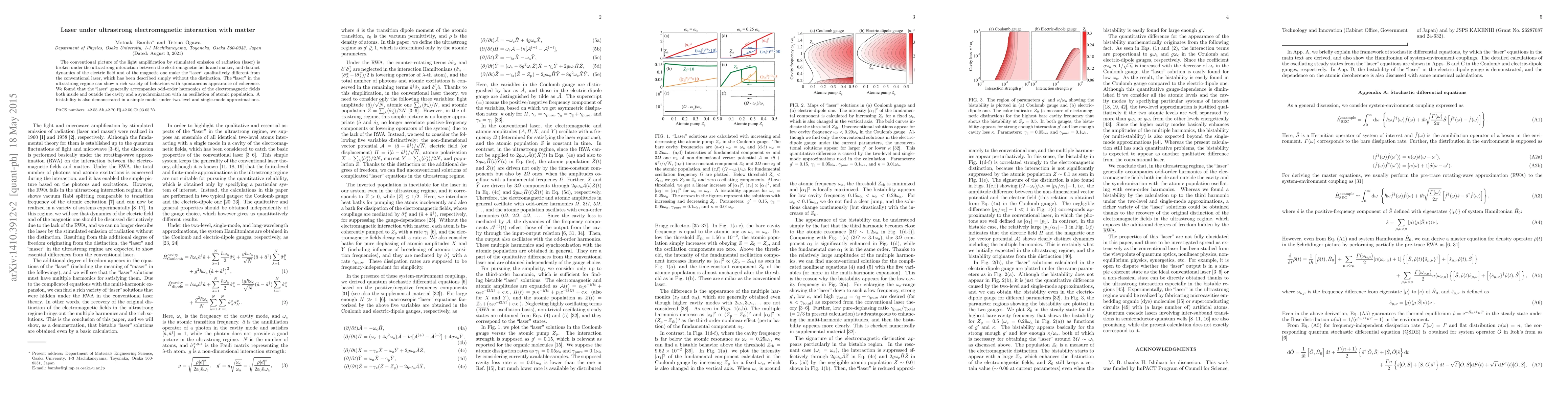 This paper explores the behavior of lasers under ultrastrong electromagnetic interactions with matter, revealing distinct dynamics and spontaneous coherence. It demonstrates the emergence of odd-order harmonics and synchronization with atomic population oscillations, along with bistable behavior in a simplified model.