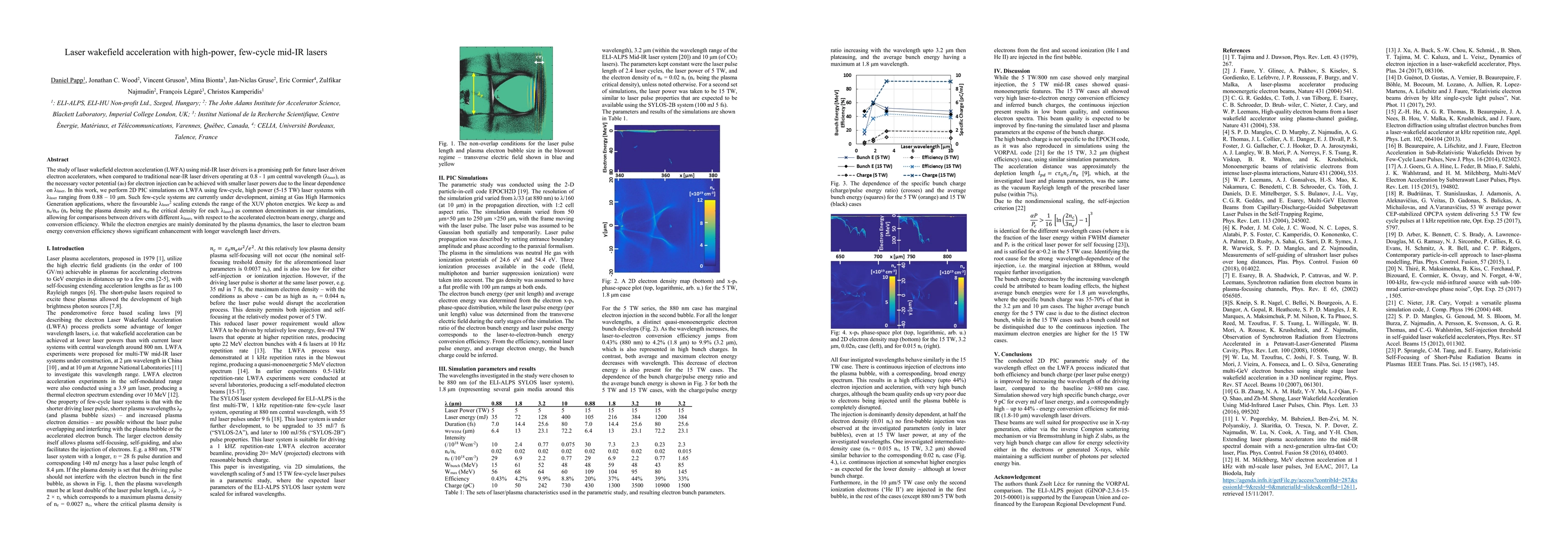 This research investigates laser wakefield electron acceleration (LWFA) using mid-IR laser drivers, demonstrating that they can achieve necessary vector potential with lower power compared to traditional near-IR lasers. Simulations show significant improvements in electron beam energy conversion efficiency with longer wavelength lasers, despite plasma dynamics primarily influencing electron energies.