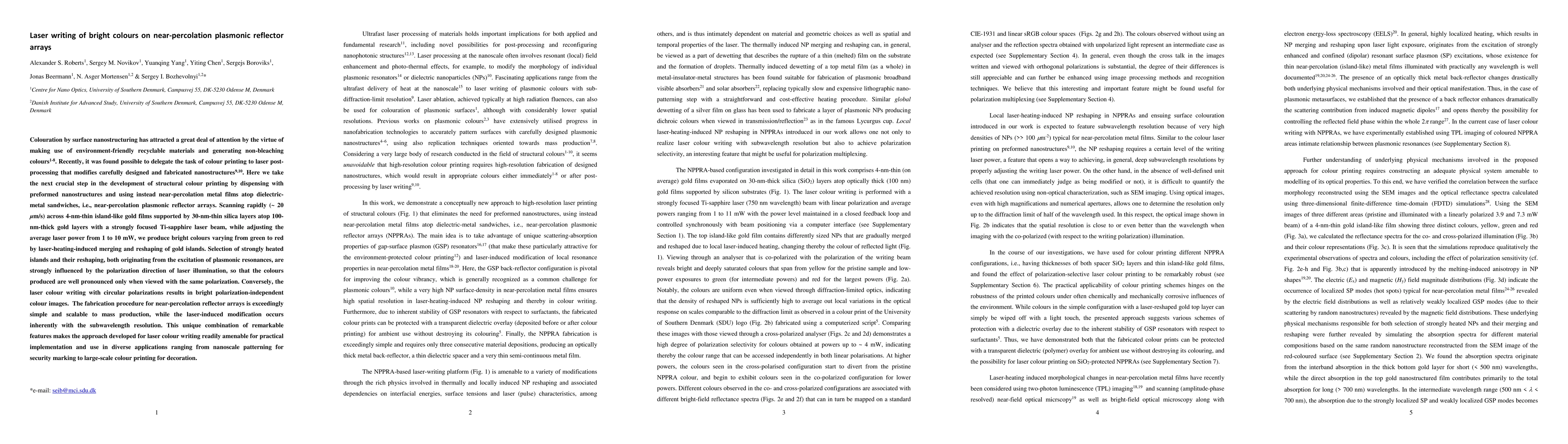 This research develops a method for laser writing of bright colours on near-percolation plasmonic reflector arrays, achieving structural colour printing without preformed nanostructures. The method uses laser-induced reshaping of gold islands atop silica layers to produce polarization-dependent and independent bright colours.