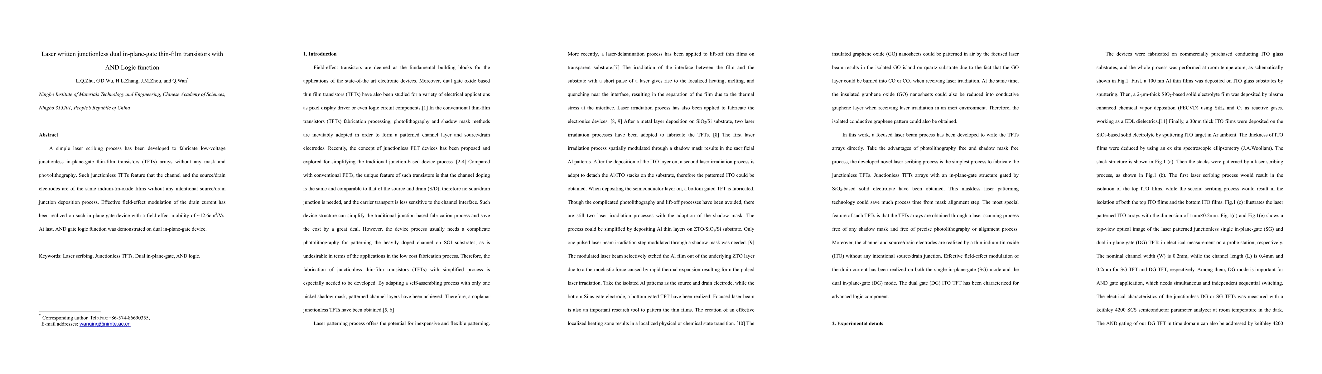 A laser scribing method has been utilized to create low-voltage junctionless in-plane-gate thin-film transistors (TFTs) without the need for masks or photolithography, demonstrating effective field-effect modulation and successfully implementing an AND gate logic function.