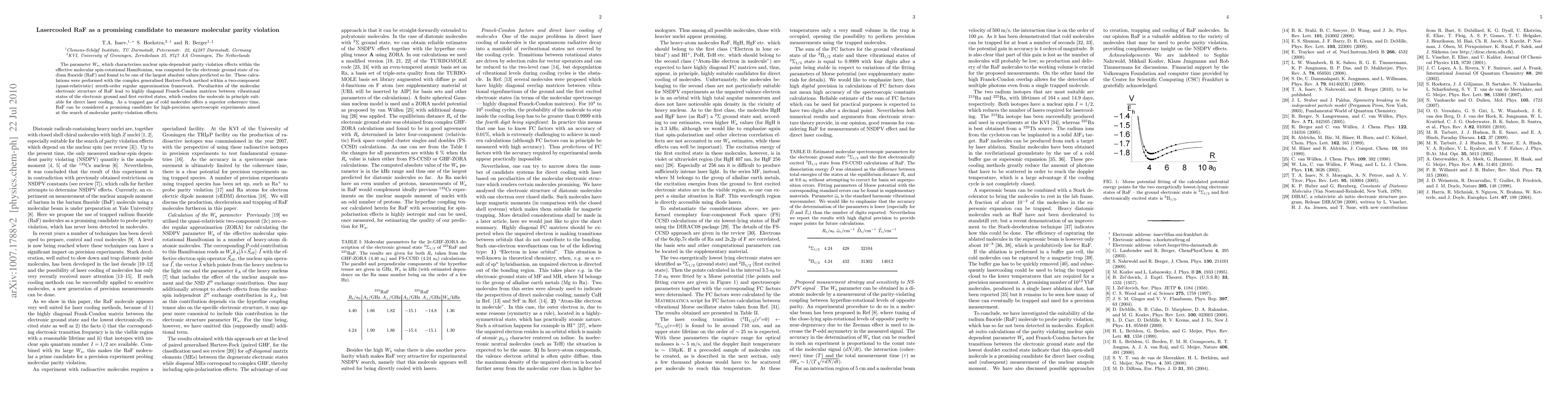 The radium fluoride (RaF) molecule exhibits a large nuclear spin-dependent parity violation parameter, making it a strong candidate for high-precision spectroscopic experiments to measure molecular parity violation. Its unique electronic structure allows for direct laser cooling, enhancing its suitability for such experiments.